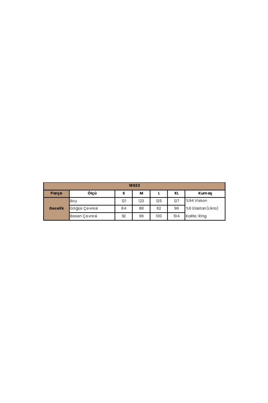 Gecelik: Siyah renklidir, derin V Yakalıdır, göğüs ve sırt dekoltelidir, ayalanabilir ip askılıdır, yakası ve göğüs kenarları ile sırtı dantellidir, yırtmaçlıdır, örme kumaştır.