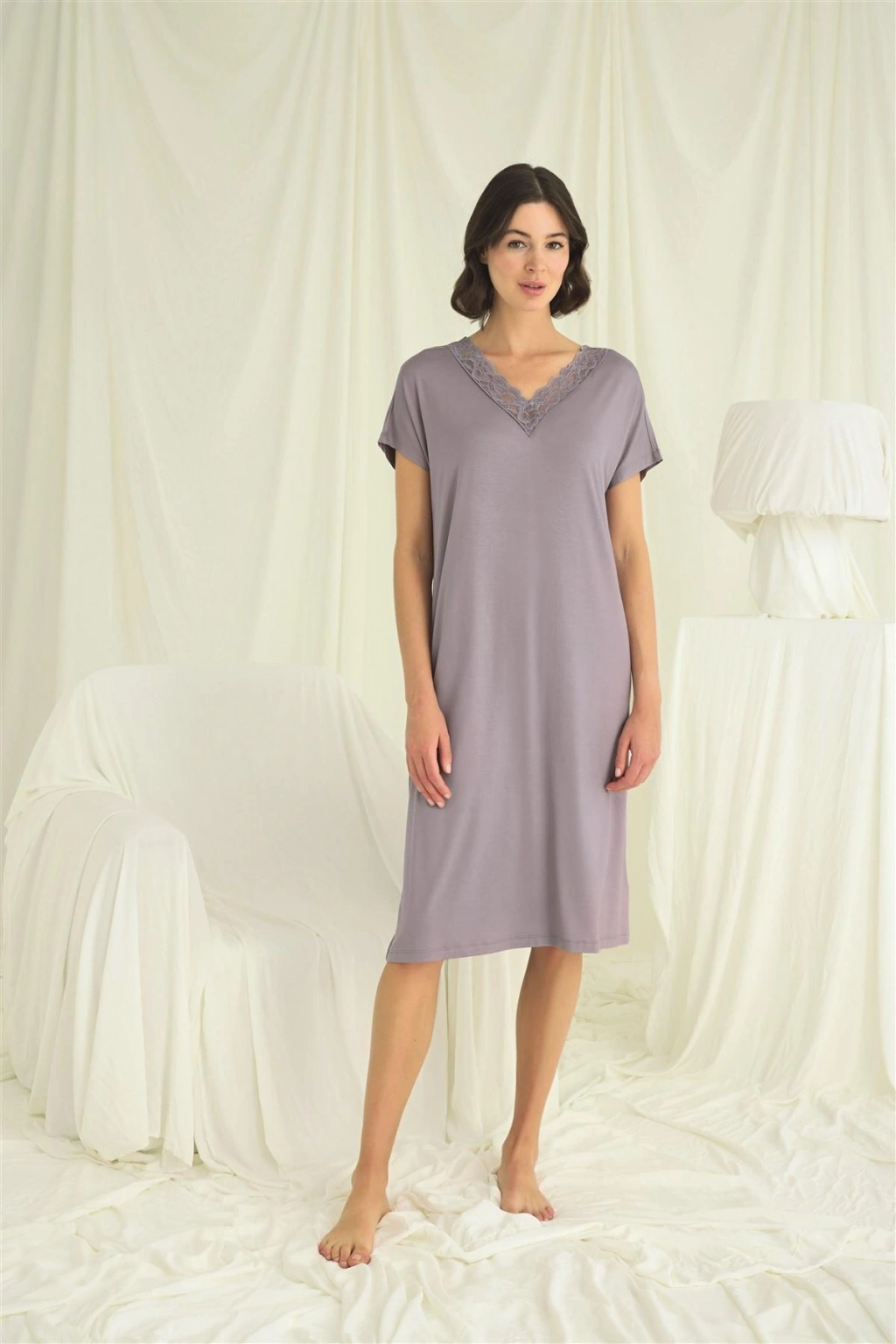 Gecelik: V yakalıdır, kısa kolludur, yakası dantellidir, Gri renklidir, örme kumaştır.Materyal%94 Viskon %6 Elastan