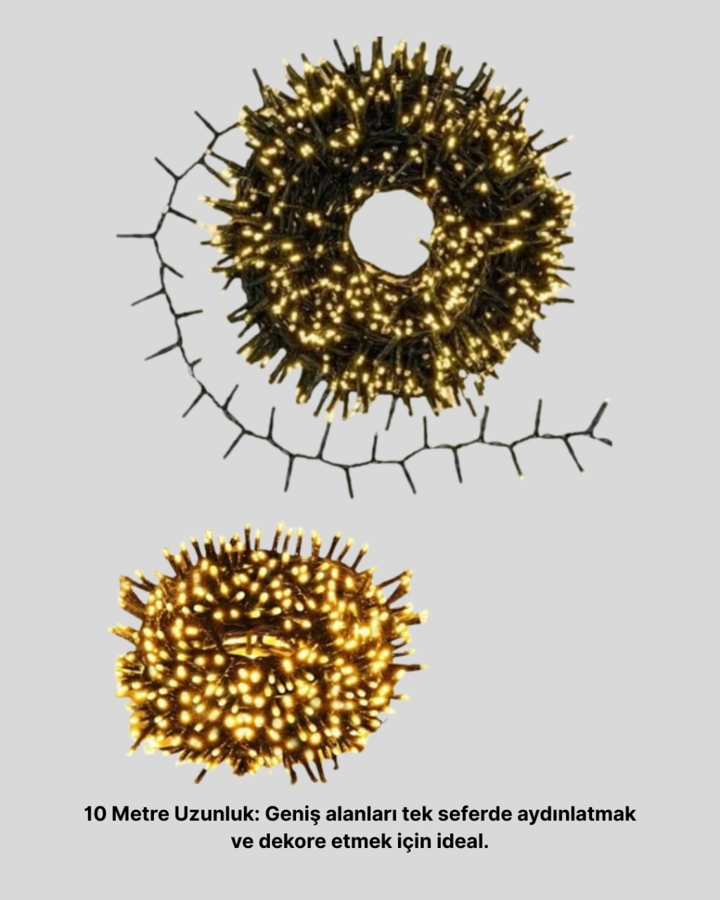 Özel günlerinizi unutulmaz bir hale getirmek için tasarlanan 10 metrelik LED ışıklı dekoratif aydınlatma, kutlamalarınıza şıklık ve enerji katar. Gerçek gün ışığı kalitesinde aydınlatma sunan LED teknolojisi, düşük enerji tüketimi ile uzun ömürlü kullanım sağlar. Uzaktan kumanda ile ışıkları kolayca açıp kapatabilir, dekorasyonunuza uygun atmosferi dilediğiniz an yaratabilirsiniz. Animasyonlu ışık efektleri, partilerde, düğünlerde, doğum günlerinde veya özel davetlerde eşsiz bir görsel şölen sunar. Hafif ve taşınabilir yapısı sayesinde kolayca kurulabilir ve farklı mekânlarda kullanılabilir. Dayanıklı malzemesi ile uzun süreli kullanım sağlayan bu dekoratif ürün, tekrar tekrar değerlendirilebilir. Şık tasarımı ve modern görünümü sayesinde ev dekorasyonunda da tercih edilebilir. Kısacası bu 10 metrelik LED ışıklı süsleme, her kutlamada estetik ve pratik bir çözüm sunar.