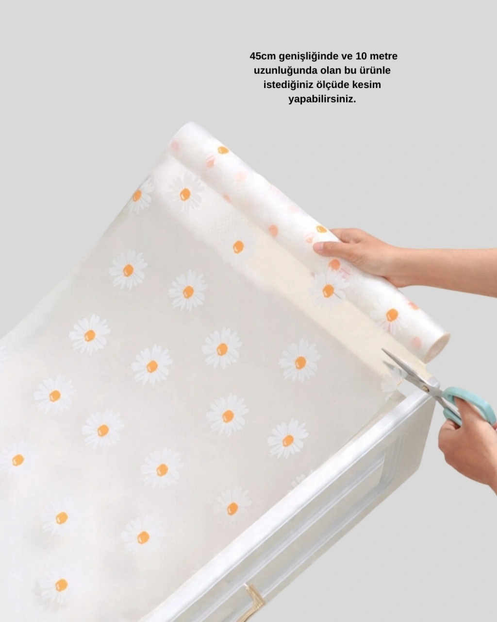 Bu 10 metre papatya desenli kaymaz çekmece matı, yüzeyleri korurken düzeni de sağlar. Uzun yapısı sayesinde geniş çekmecelerde tek parça halinde kullanılabilir.Kaydırmaz özelliği, eşyaların güvenle saklanmasını sağlar. Yapışkan kalıntı bırakmaz. Kolay temizlenebilir olması hijyenik kullanım sunar. Papatya desenleri ile estetik bir görünüm sağlar.