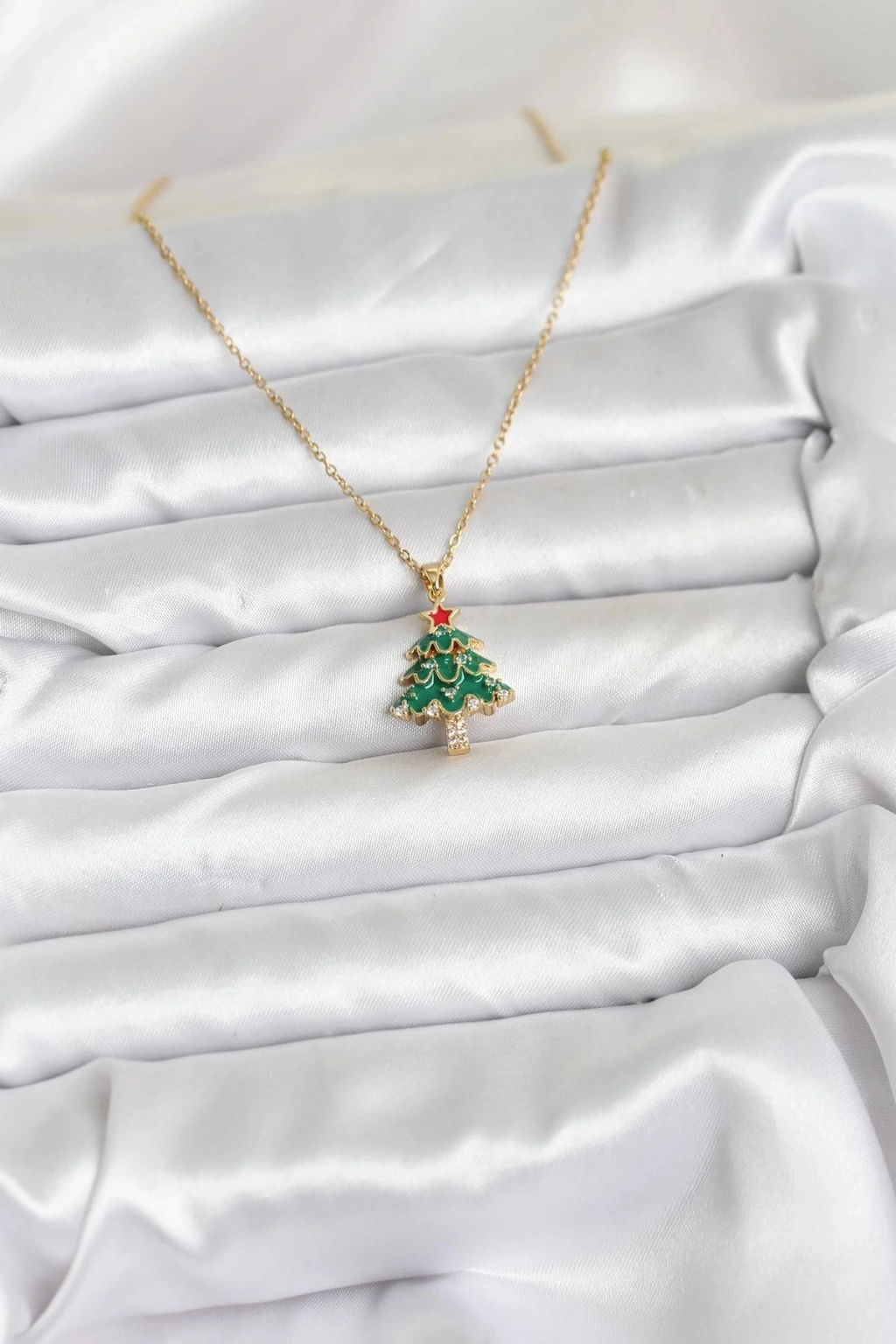 CEYLAN ADAM 316L Çelik Zincir Gold Renk Kırmızı Çam Ağacı Model Yılbaşı Temalı Kadın Kolye