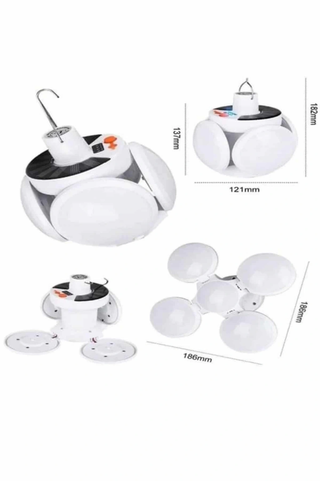 Solar Güneş Enerjisi ve USB Şarjlı 5 Kanatlı Taşınabilir Lamba – Çok Fonksiyonlu, Su Geçirmez ve Enerji Verimli AydınlatmaAçık hava etkinliklerinde, kamp gezilerinde veya acil durumlarda kullanabileceğiniz mükemmel bir taşınabilir aydınlatma çözümü arıyorsanız, Solar Güneş Enerjisi ve USB Şarjlı 5 Kanatlı Lamba tam size göre! Bu pratik lamba, güneş enerjisi ile şarj olabileceği gibi, USB ile de kolayca şarj edilebilir ve her koşulda güvenilir bir ışık kaynağı sunar.5 kanatlı tasarımı, ışığın yayılmasını etkili bir şekilde sağlayarak geniş alanları aydınlatmanızı mümkün kılar. Katlanabilir yapısı sayesinde ışık açısını ihtiyacınıza göre ayarlayabilirsiniz. Böylece karanlık alanlarda daha geniş bir alanı rahatlıkla aydınlatabilirsiniz.Güneş paneli ile doğa dostu bir enerji kaynağı kullanabileceğiniz gibi, USB ile şarj etme seçeneği de sunan bu lamba, her ortamda pratik kullanım imkânı sağlar. Solar şarj ile çevreye duyarlı bir şekilde enerji elde ederken, USB şarj özelliği sayesinde hızlı ve pratik bir şekilde enerji depolayabilirsiniz.Su geçirmez IP65 özelliği, dış mekanlarda kullanım için ekstra dayanıklılık sunar. Yağmurda veya nemli koşullarda bile güvenle kullanılabilir. Ürün, 45 LED ışık kaynağı ile karanlık ortamlarda yüksek kaliteli ışık sağlar ve 6500K renk sıcaklığı ile net ve parlak bir aydınlatma sunar.Teknik Özellikler:Güneş Paneli: 5.5V polikristal silikon güneş paneliPil: 18650 lityum pil, 2400mAhIşık Kaynağı: 45 LEDÇalışma Süresi: 6-8 saatŞarj Süresi: Solar şarj için 8 saat / USB şarj ile 6 saatŞarj Yöntemi: Solar şarj (DC 3.5V) / USB şarj (voltaj 4.5V)Su Geçirmezlik: IP65Renk Sıcaklığı: 6500KÜrün Boyutu: 14 cm * 11.5 cmPaket İçeriği:1 Adet 5 Kanatlı Solar Pratik LambaAcil durumlarda, kamp gezilerinde veya açık hava etkinliklerinde güvenle kullanabileceğiniz bu solar lamba, size her zaman güvenli, verimli ve çevre dostu bir ışık kaynağı sunar. Hem güneş enerjisiyle hem de USB ile şarj edilebilen bu pratik aydınlatma aracı, her koşulda size yardımcı olur.