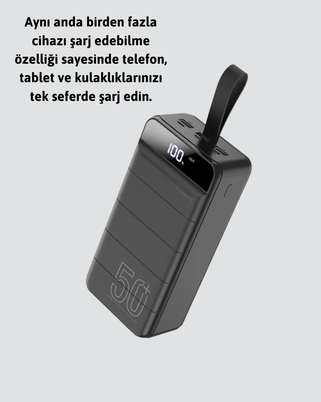 50.000 mAh dev batarya kapasitesine sahip bu powerbank, uzun süreli şarj ihtiyaçlarını karşılamak için özel olarak tasarlanmıştır. Akıllı telefon, tablet, kulaklık, kamera ve USB ile şarj edilebilen tüm cihazlarla uyumlu olan bu cihaz, günlük hayatınızda kesintisiz enerji desteği sunar. Üzerinde bulunan LED dijital gösterge sayesinde mevcut şarj seviyesini kolayca takip edebilir, böylece sürpriz şarj bitmeleri yaşamazsınız. Dört adet USB çıkışı ile aynı anda birden fazla cihazı şarj edebilir, Type-C, Lightning ve Micro USB giriş seçenekleri sayesinde farklı cihazlarla uyumlu kullanım sağlayabilirsiniz. Ultra hızlı şarj özelliği, cihazlarınızı kısa sürede tam kapasiteye ulaştırırken gelişmiş koruma sistemi aşırı ısınma, akım fazlalığı ve kısa devreye karşı güvenli kullanım sunar. Kompakt ve şık tasarımı ile taşınabilirlik açısından da oldukça pratiktir. Özellikle seyahatlerde, işte veya günlük hayatta enerjiye ihtiyaç duyduğunuz her an yanınızda kolayca taşıyabileceğiniz bu ürün, ayrıca dahili LED ışığı sayesinde karanlık ortamlarda ek bir aydınlatma kaynağı da sağlar. 50.000 mAh kapasitesiyle uzun yolculuklarda, kamp aktivitelerinde veya yoğun iş günlerinde güvenilir enerji desteği sunar.