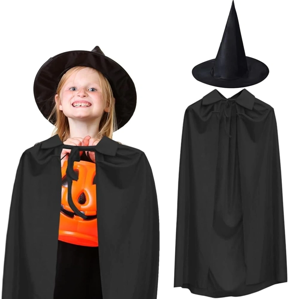 CEYLAN ADAM 120 cm Siyah Yakalı Cadı Pelerini Cadı Şapkası ve 1 Çift Siyah Kumaş Eldiven Seti 3 Parça