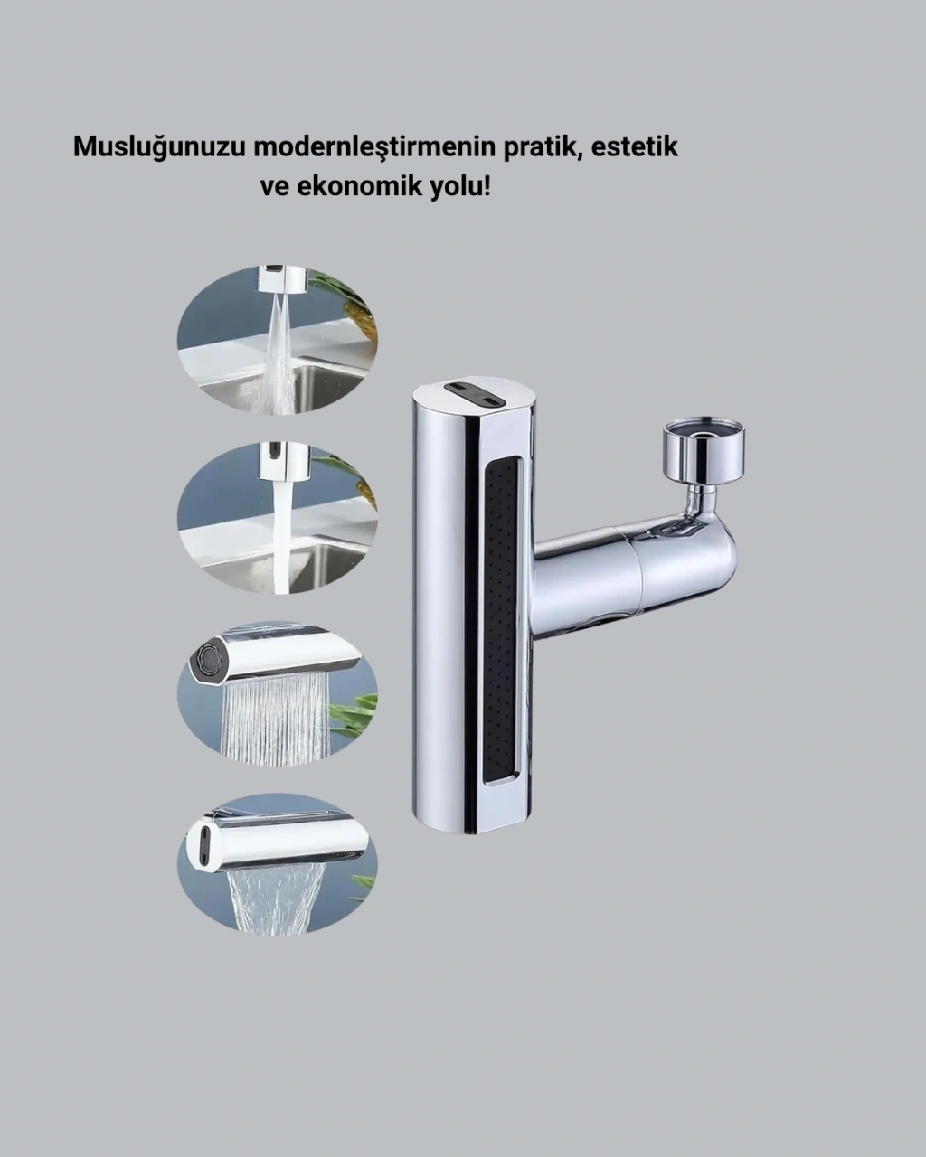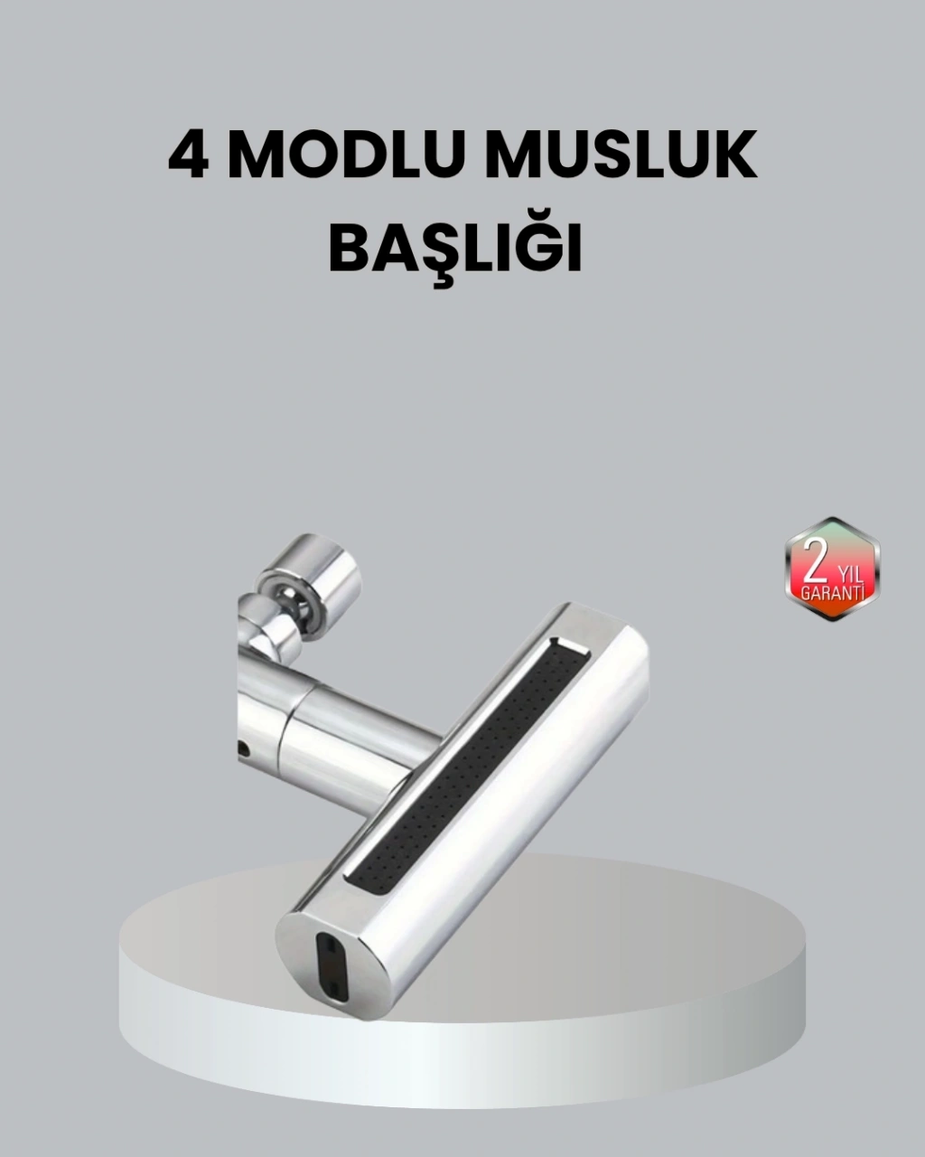 Fonksiyonelliği ve dayanıklılığı bir araya getiren ABS + Pirinç Alaşımlı Musluk Başlığı, modern evlerin vazgeçilmez yardımcılarından biri.4 farklı su çıkış modu (yağmur, şelale, sprey, kabarcık) ile ihtiyacınıza göre su akışını ayarlayabilir, suyu verimli kullanarak tasarruf sağlayabilirsiniz.360° dönebilen yapısı, lavabonun tüm bölgelerine kolay erişim sunar.Bu özellik özellikle geniş lavabolarda pratiklik sağlar ve bulaşık yıkama ya da temizlik işlemlerinde maksimum konfor sunar.Dayanıklı ABS ve pirinç malzeme, uzun ömürlü kullanım için korozyon ve paslanmaya karşı koruma sağlar.Kolay takılıp çıkarılabilen başlığı sayesinde dakikalar içinde monte edebilirsiniz.Modern ve minimalist tasarımı, mutfağınıza veya banyonunuza estetik bir görünüm kazandırır.Su tasarrufu, dayanıklılık ve şıklığı bir arada sunan bu musluk başlığı, günlük hayatı kolaylaştırmak için mükemmel bir tercihtir.