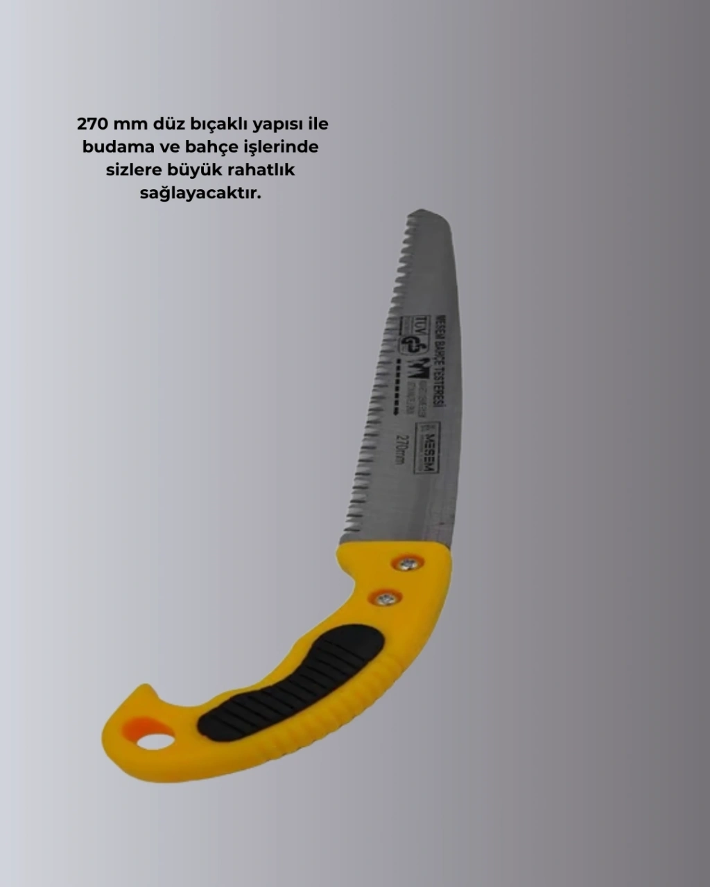 Budama ve bahçe bakım işlemlerinde güvenilir bir kesim performansı sunan bu bahçe testeresi, lazer bilenmiş düz bıçak yapısıyla öne çıkar. 270 mm bıçak uzunluğu, ince ve orta kalınlıktaki dallar için uygundur.Kullanıcı ergonomisi düşünülerek tasarlanmış sap yapısı, kaymadan rahat bir tutuş sağlar. Kılıflı tasarımı sayesinde hem güvenli hem de pratik bir kullanım sunar.