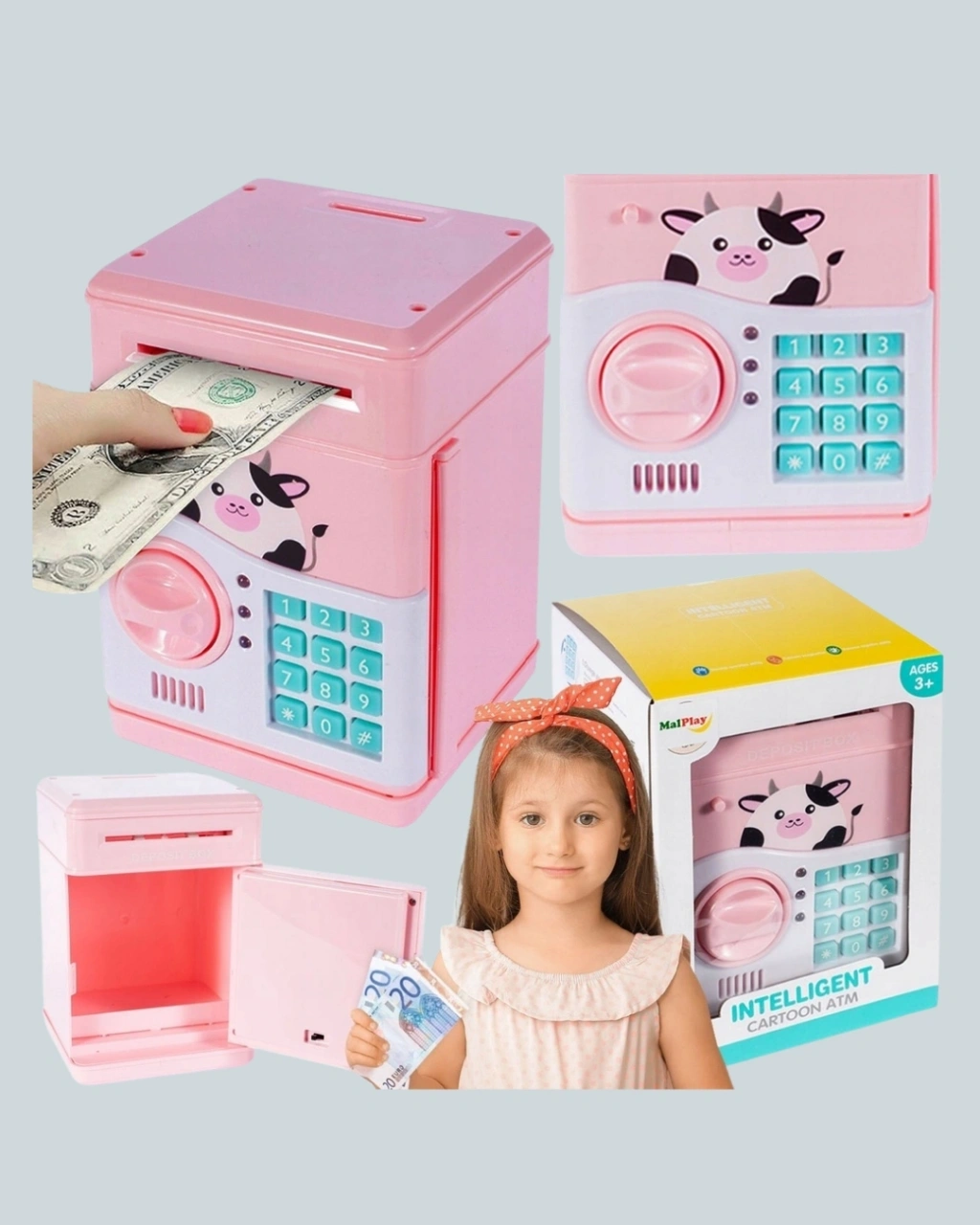 Pembe renkli bu elektronik şifreli ATM kumbarası, çocukların tasarrufu öğrenmesini eğlenceli hale getirir. Otomatik para çekme sistemi ve ışıklı efektleriyle dikkat çeker.Sağlam yapısı sayesinde güvenli kullanım sunar. Eğitici özelliği ile çocuklara para bilinci kazandırır. Özel günler için harika bir hediyedir.