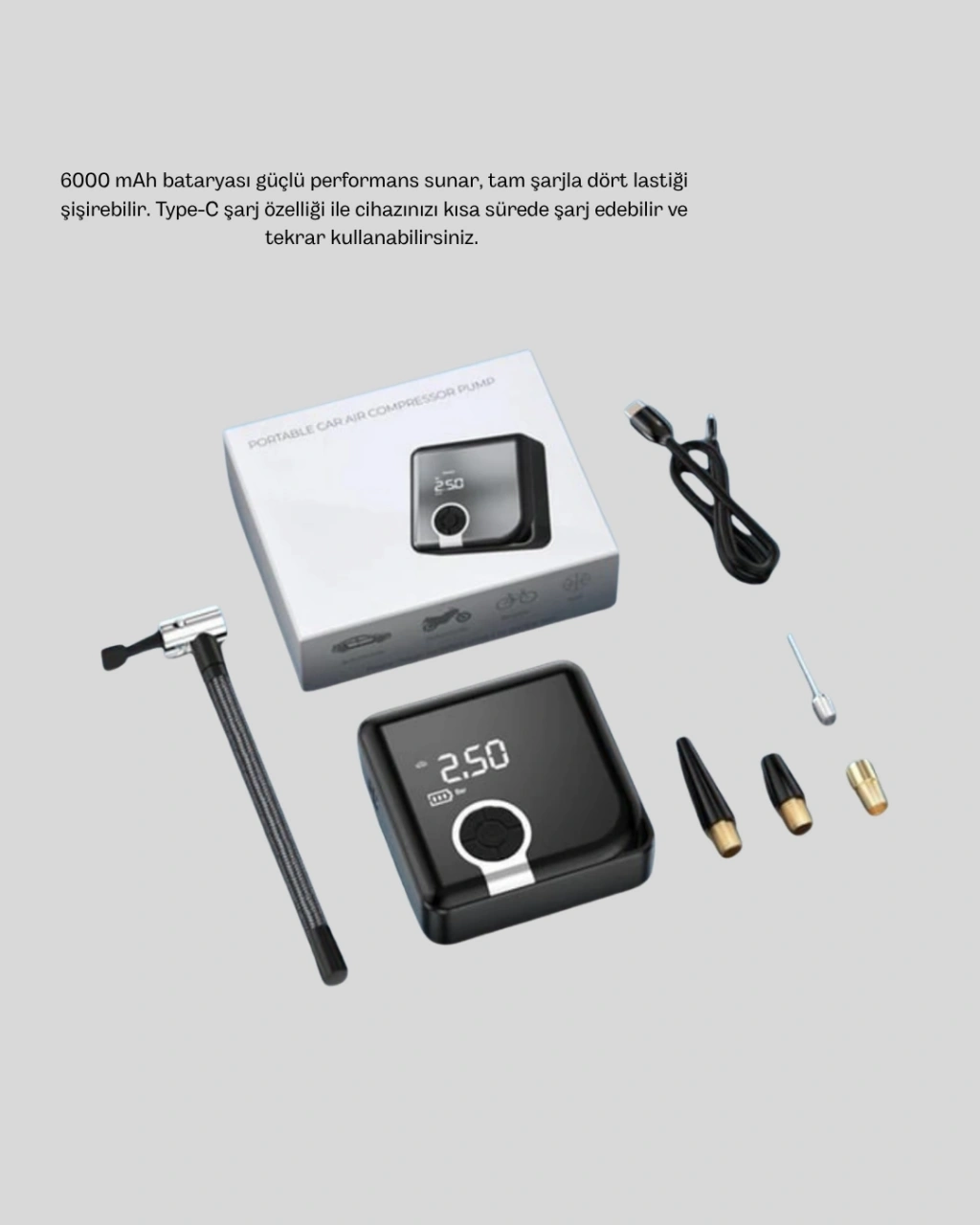 Taşınabilir Şarjlı Akıllı Hava Kompresörü, ihtiyaç duyduğunuz her an hızlı ve güçlü performans sağlayan yenilikçi bir hava basınç cihazıdır. 150 PSI’a kadar ulaşan yüksek basınç kapasitesi ile otomobil, motosiklet ve bisiklet lastiklerinin yanı sıra spor topları, deniz ürünleri, şişme yataklar ve kamp ekipmanları gibi birçok ürünü şişirmeye uygundur. Kompakt yapısı sayesinde aracınızda, evde ya da çantanızda kolayca yer kaplar.Dijital ekranı üzerinden basıncı net bir şekilde takip edebilir, istediğiniz değeri hassasiyeti yüksek kontrol sistemi ile ayarlayabilirsiniz. Akıllı otomatik kapanma özelliği sayesinde cihaz, önceden belirlenen basınca ulaştığında kendiliğinden durur. Bu durum hem lastiğin fazla şişmesini engeller hem de cihazın uzun ömürlü kullanımına katkı sağlar.6000 mAh batarya kapasitesi, cihazın tek şarjla dört lastiği şişirebilmesini mümkün kılar. Type-C hızlı şarj özellikli olması, modern cihazlarla uyumlu kullanım sağlar. İhtiyaç halinde powerbank ile bile şarj edilebilmesi sayesinde her ortamda çalıştırabilirsiniz. Ayrıca cihazın üzerinde yer alan LED aydınlatma ve SOS ışığı, özellikle gece yolculuklarında hayat kurtarıcı bir detay olarak öne çıkar.Kompresörün güçlü motoru sessiz ve stabil çalışır. Titreşim azaltıcı gövde tasarımı sayesinde kullanım sırasında konfor sağlar. Aynı zamanda ergonomik tutuşu ile elinizde kolayca kavrayabilir ve uzun süre rahatlıkla kullanabilirsiniz. Dayanıklı malzemelerden üretilmiş gövdesi, darbeye ve dış etkenlere karşı koruma sağlar. Spor, kamp, seyahat ve günlük kullanım için ideal olan bu ürün, pratikliği ve performansıyla beklentileri fazlasıyla karşılar.