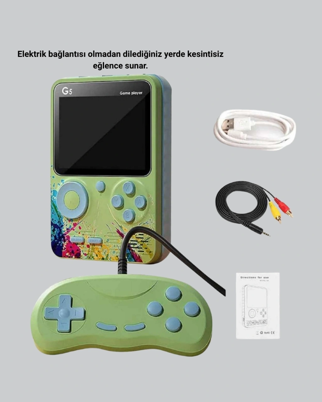 G5 Taşınabilir Retro Oyun Konsolu, klasik oyun kültürünü yeniden canlandıran çok yönlü bir eğlence cihazıdır. Hafızasında bulunan 500 adet efsanevi oyun, geçmişin en sevilen anlarını bugüne taşır. Aksiyon, spor, yarış, bulmaca ve macera oyunları ile her yaşa hitap eder.3 inç HD dijital ekran, yüksek renk doğruluğu ve net görüntü sunar. Arka aydınlatmalı ekran sayesinde ister gündüz ister gece, her ortamda kesintisiz oyun keyfi yaşayabilirsiniz. AV çıkışı ile televizyona bağlanarak büyük ekranda oynama deneyimini kolayca elde edebilirsiniz.600 mAh şarj edilebilir batarya, 3 saate kadar kesintisiz oynama süresi sağlar. USB kablo ile hızlıca şarj edilebilir. Kompakt ve hafif yapısı sayesinde her yere rahatça taşınabilir. Hem ergonomik tasarımı hem de uzun pil ömrüyle seyahatlerde ideal bir eğlence arkadaşıdır.G5 Game Box, doğum günü veya özel gün hediyesi olarak çocuklara harika bir sürpriz sunar. Hem erkek hem kız çocuklarının ilgisini çekecek renkli tasarımı ve kolay kullanımı ile evde, okulda veya tatilde oyun keyfini her an yaşatır.