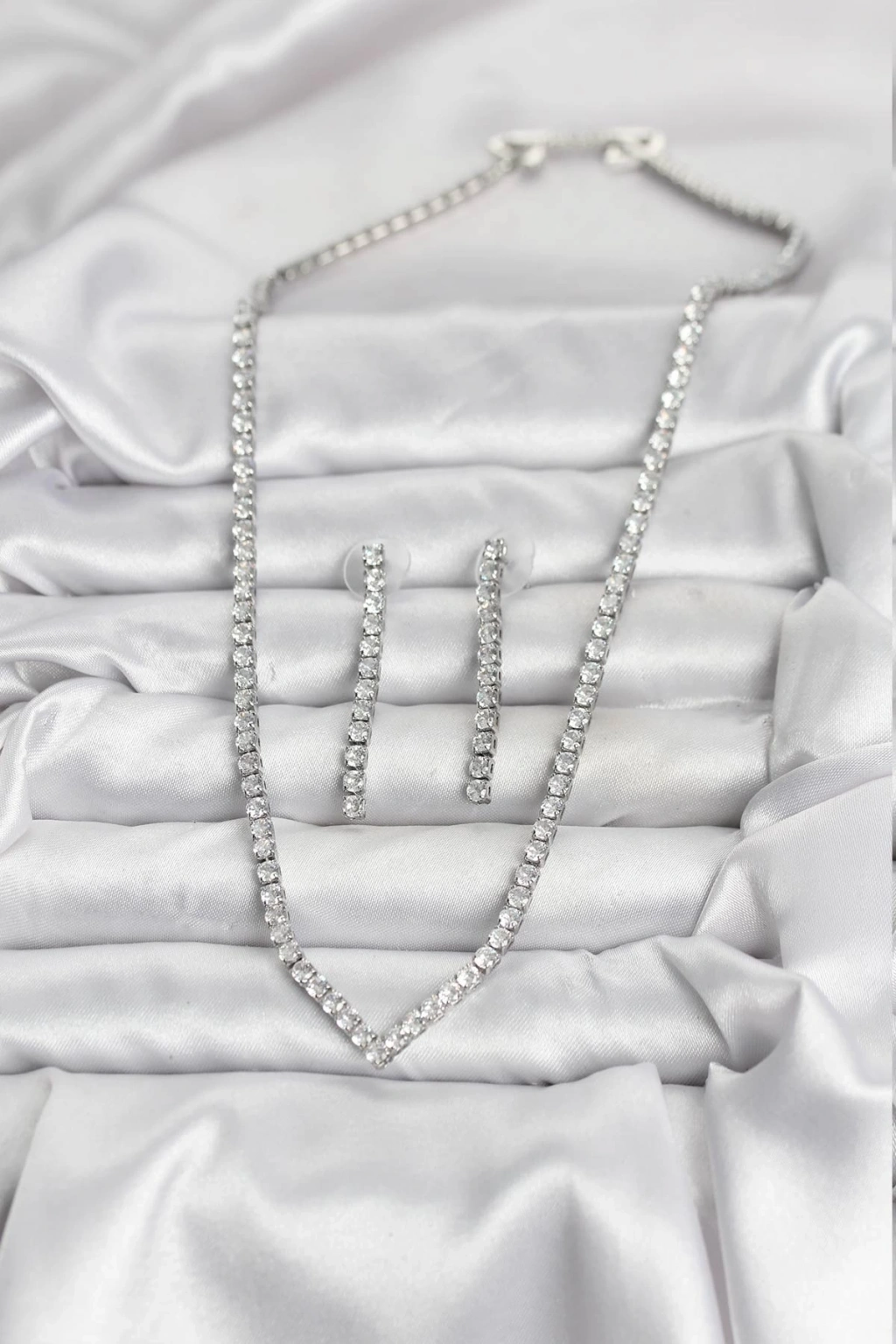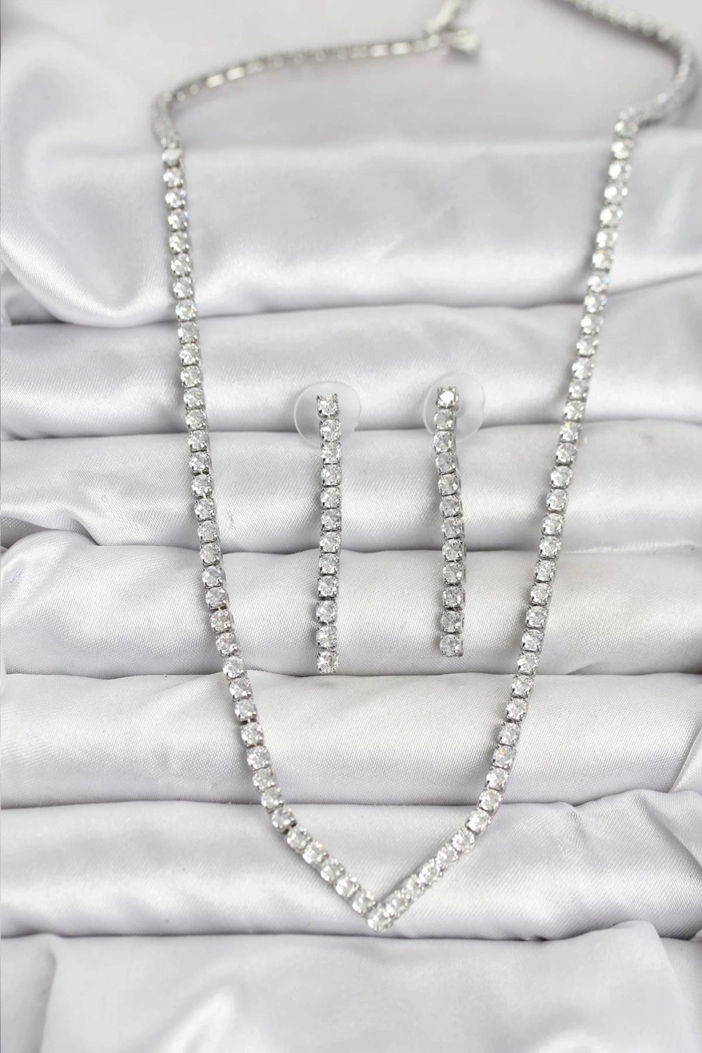 • CEYLAN ADAM Gümüş Renk Zirkon Taşlı Kadın Kolye Küpe Seti