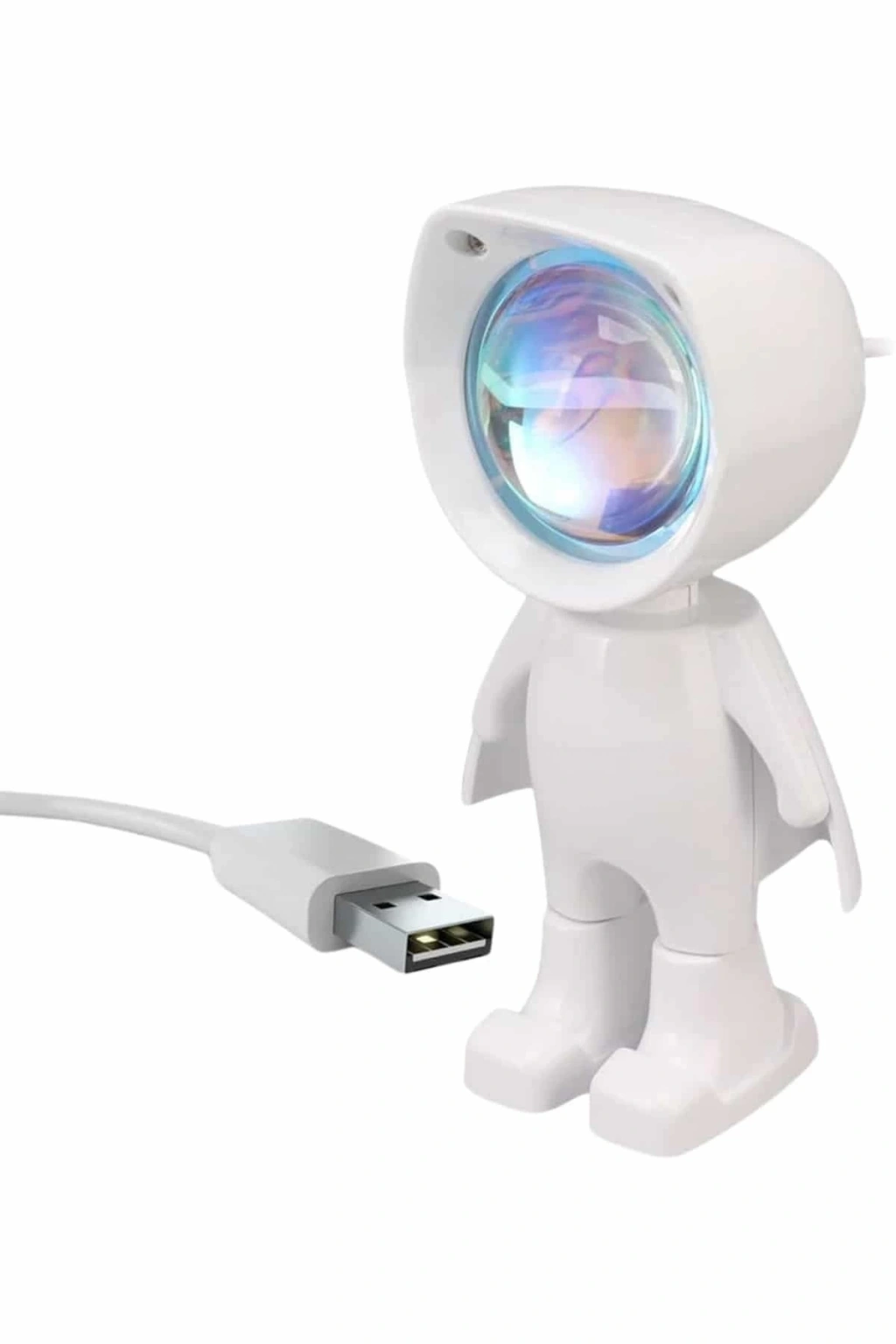 Bu sevimli astronot temalı gün batımı projektör lambası, hem dekoratif hem de fonksiyonel bir aydınlatma çözümü sunar. Gündelik kullanımda modern ve eğlenceli tasarımıyla bulunduğu ortama estetik bir hava katarken, aktif kullanıldığında ise yumuşak ve sıcak tonlardaki gün batımı efektli ışığıyla rahatlatıcı bir atmosfer oluşturur. USB ile şarj edilebilen bu ürün, taşınabilir yapısı sayesinde ev dışında da kolaylıkla kullanılabilir.5 Watt gücündeki LED ışık kaynağı, enerji verimliliğini yüksek seviyede tutarken uzun süreli kullanım olanağı sunar. Lamba kafasının 360 derece yatay ve 60 derece dikey dönebilen yapısı, ışığın yönünü dilediğiniz gibi ayarlayabilmenizi sağlar. Bu sayede ışığı bir duvara, tavana veya direkt olarak belirli bir alana yönlendirmek oldukça kolaydır.Dokunmatik kontrol paneli, kullanım deneyimini sade ve pratik hale getirir. Tek bir dokunuşla lambayı açıp kapatabilir, parlaklık seviyesini ihtiyacınıza göre ayarlayabilirsiniz. Işığın tonu ise özellikle gece saatlerinde göz yormadan huzur verici bir ortam yaratmak üzere tasarlanmıştır.Kompakt boyutları ve kablosuz kullanımı, bu lambayı yatak odasından oturma odasına, seyahatlerden açık hava etkinliklerine kadar her ortamda kullanışlı kılar. Kutu içerisinden çıkan USB kablosu ile şarj edilebilen cihaz, tam dolum sonrası 3-4 saat kesintisiz aydınlatma sunar.Gün batımı efektli ışık, özellikle fotoğraf ve video çekimlerinde estetik ve yaratıcı sonuçlar elde etmenizi sağlarken; gece lambası olarak da sıcak ve romantik bir ambiyans yaratır. Dinlenme, meditasyon veya özel anlarda size eşlik edecek bu lamba, hem kişisel kullanım hem de hediye alternatifi olarak ideal bir tercihtir.