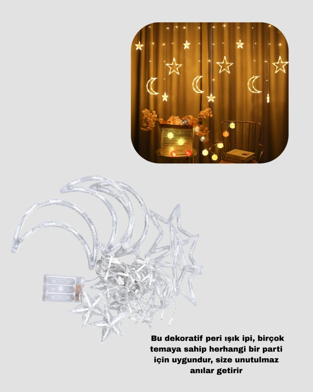 İç ve dış mekan uyumlu pilli yıldız ay perde led, her ortamda rahatlıkla kullanılabilen dekoratif bir aydınlatma ürünüdür. Yıldız ve ay figürlerinin birleşimiyle oluşturulan bu perde ışıklar, bulunduğu alana romantik ve sıcak bir hava katar.126 adet LED ışık sayesinde güçlü ama göz yormayan bir aydınlatma sağlar. İki farklı mod seçeneği ile kullanım amacına göre ışık ayarı yapılabilir. Pille çalışması, ürünü son derece pratik hale getirir ve kablo karmaşasını ortadan kaldırır.Balkon, bahçe, pencere, duvar, giriş kapısı ve vitrin dekorasyonlarında rahatlıkla kullanılabilir. Ticari alanlar, restoranlar ve oteller için de şık bir dekoratif çözüm sunar.Güvenli ve dayanıklı yapısı sayesinde uzun süreli kullanımlarda bile sorun yaşatmaz. Isınma yapmaz ve güvenli kullanım sunar.
