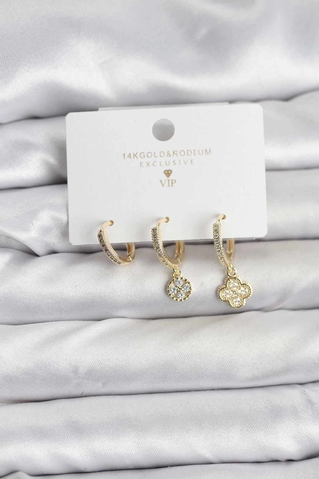 • CEYLAN ADAM Pirinç Gold Renk Yonca Model 3'lü Kadın Küpe Seti