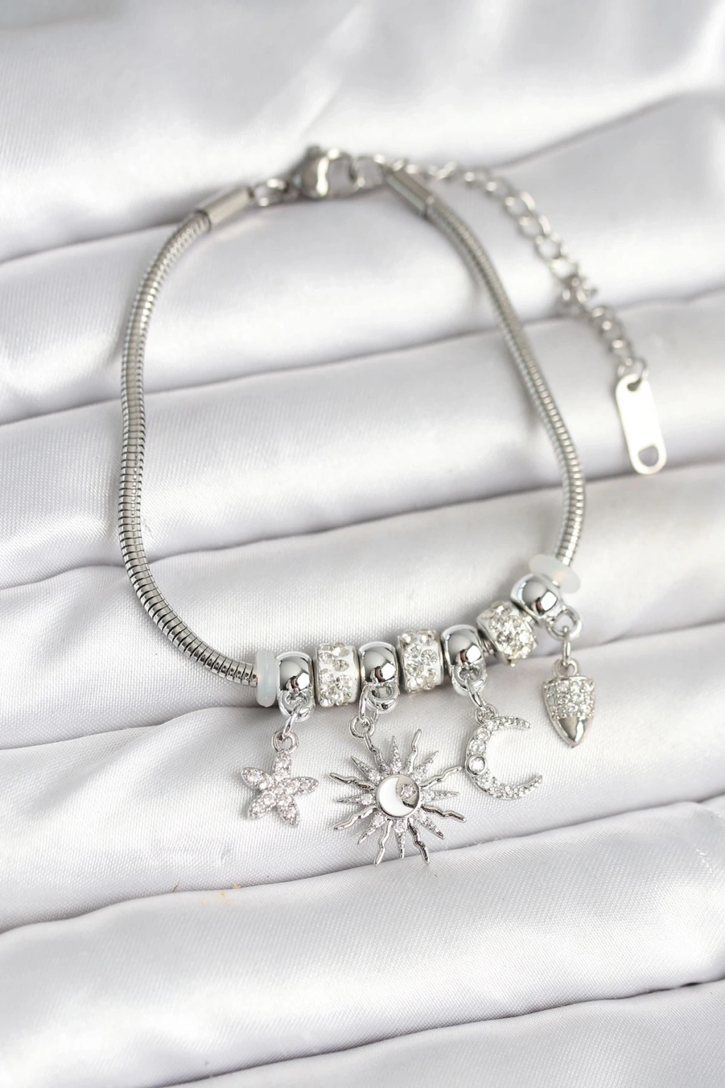 CEYLAN ADAM Pirinç Gümüş Renk Ay ve Güneş Charmlı Kadın Bileklik
