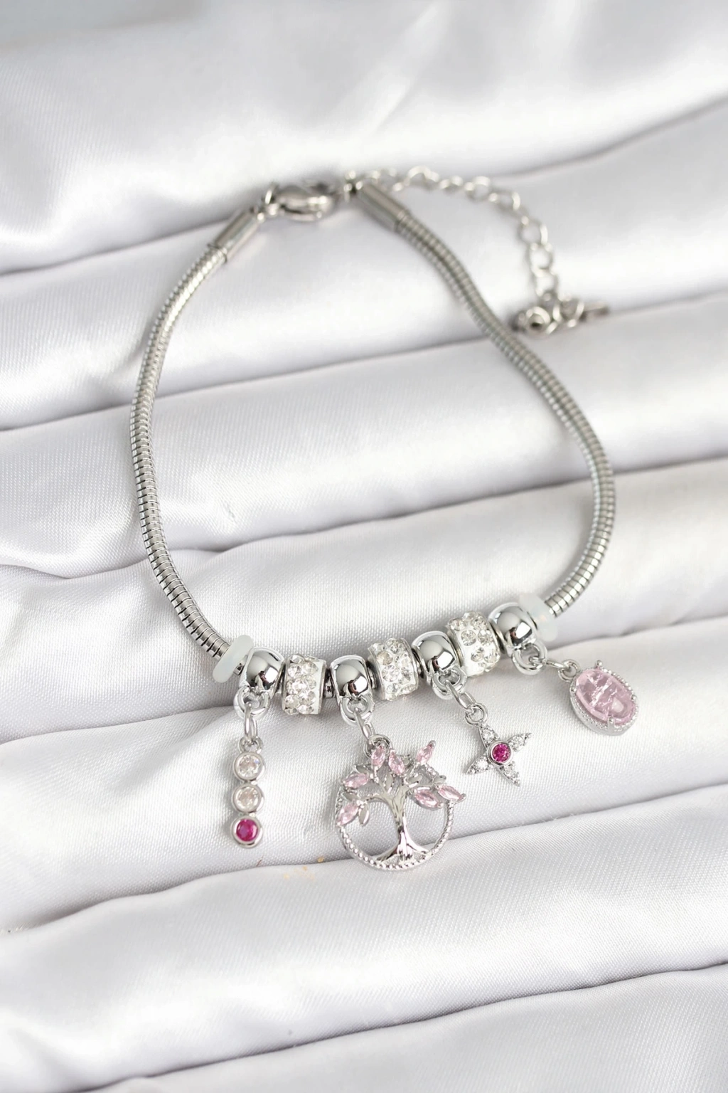 CEYLAN ADAM Pembe Kelebek Charmlı Gümüş Renk Kadın Bileklik
