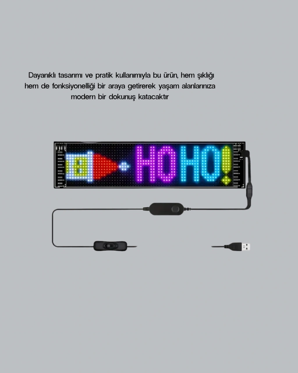 Yenilik ve estetiği bir araya getiren RGB LED Panel, ortamınıza hareket ve enerji katmak için tasarlandı. Mobil uygulama desteğiyle yüzlerce GIF, animasyon veya kişisel mesajı kolayca ekleyebilir, istediğiniz görüntüyü anında LED ekranda gösterebilirsiniz. Dilersen reklam amaçlı kullanın, dilerseniz aracınıza özel bir görünüm kazandırın!Bu panel, USB bağlantısı sayesinde 5V 2A güçle tüm cihazlardan kolayca çalıştırılabilir. Arabalar, kamyonlar, otobüsler, vitrinler, ev içi dekorasyon veya ofis kullanımı için mükemmeldir. Enerji tasarruflu LED yapısı, yüksek parlaklıkla uzun ömürlü bir performans sunar.Kutu içeriğinde bir adet RGB LED panel, 3/4 metre USB kablo (açma-kapama anahtarlı), bir adet uzaktan kumanda, kumanda pili ve dört adet çift taraflı yapışkan bant bulunur. Basit montaj sistemi sayesinde dakikalar içinde kullanıma hazır hale gelir.Dayanıklı yapısı sayesinde dış etkenlere karşı uzun ömürlüdür. Canlı renk geçişleri ve yüksek çözünürlüklü ışık efektleriyle hem iç hem dış mekanlarda fark yaratır.RGB LED Panel, kişisel kullanımın yanı sıra markalar, işletmeler ve sürücüler için dikkat çekici bir tanıtım aracıdır. Kendi mesajınızı ışıkla ifade edin!