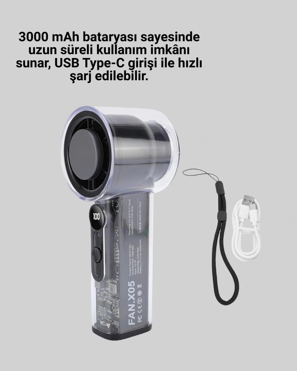 Şarjlı mini fan, yazın kavurucu sıcaklarında kişisel bir klima gibi çalışır. Ultra taşınabilir tasarımı sadece 7 oz ağırlığında olup, her yere kolayca sığar. 100 seviyeli hız ayarı ile ister hafif bir esinti, ister güçlü bir rüzgar elde edebilirsiniz. Sessiz motor teknolojisi, 30 dB’den daha düşük bir sesle çalışarak uyurken, çalışırken veya ders çalışırken sizi rahatsız etmez. Yüksek kapasiteli batarya, tek şarjla saatlerce serinlik sağlar. Üstelik çıkarılabilir askı ipi sayesinde eller serbest kullanım imkanı sunar. Spor yaparken, yürüyüşte ya da kamp alanında boynunuza, çantanıza ya da çadır direğine asarak pratik bir şekilde kullanabilirsiniz. Modern ve şeffaf tasarımıyla şıklığıyla da dikkat çeker.