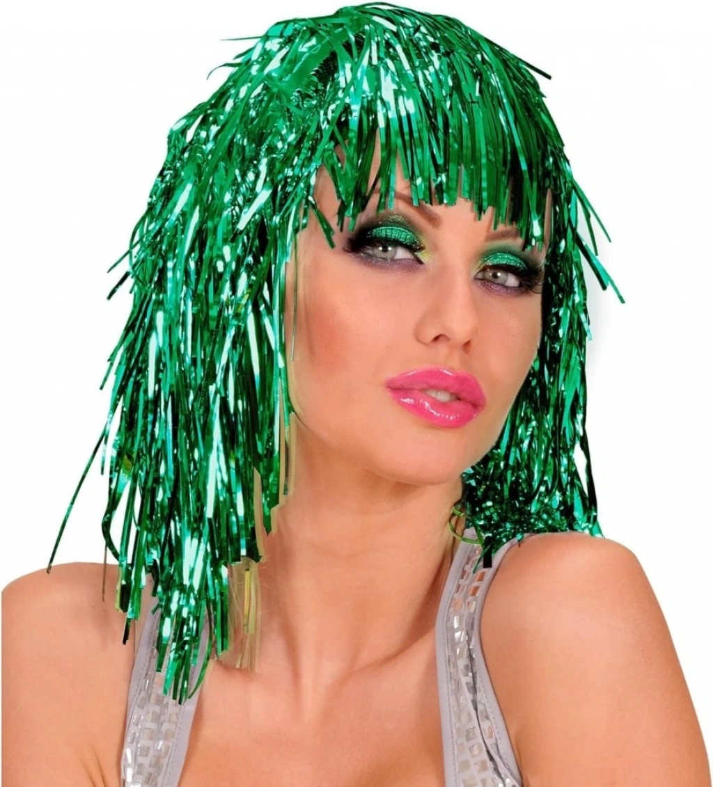 Parti tarzınıza enerji katın! Göz alıcı metalize yeşil peruk, parlak yapısıyla ışık altında mükemmel bir görünüm sağlar. Eğlenceli davetler, yılbaşı kutlamaları, doğum günleri ve sahne gösterileri için idealdir.
