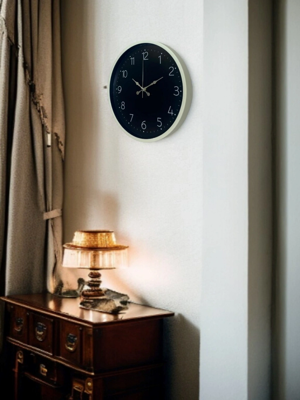 Krem renkli çerçevesi ve koyu zemin üzerindeki ince, zarif rakam tasarımıyla öne çıkan bu 36 cm duvar saati; bulunduğu ortama sakin, şık ve dengeli bir görünüm kazandırır. Minimal kadran yapısı sayesinde gözü yormaz, zamanı rahatça okumayı sağlar. Modern ve sade dekorasyon tarzlarını tamamlayan zamansız bir tasarıma sahiptir.