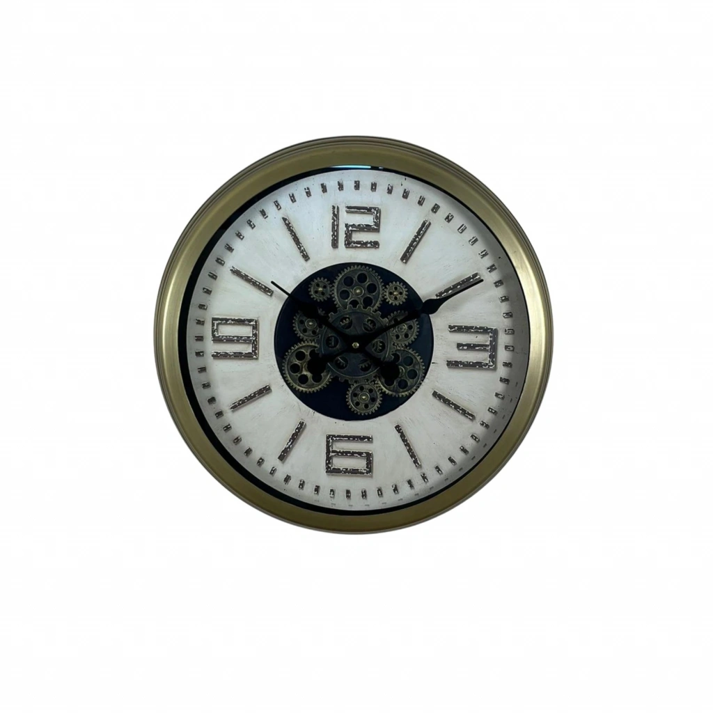 Eskitme metal çerçevesi, açık ton kadranı ve merkezde konumlanan dekoratif hareketli çark mekanizması ile bulunduğu ortamda odak noktası olur. Salon, ofis, çalışma odası, kafe ve loft tarzı mekanlar için ideal bir tamamlayıcıdır.