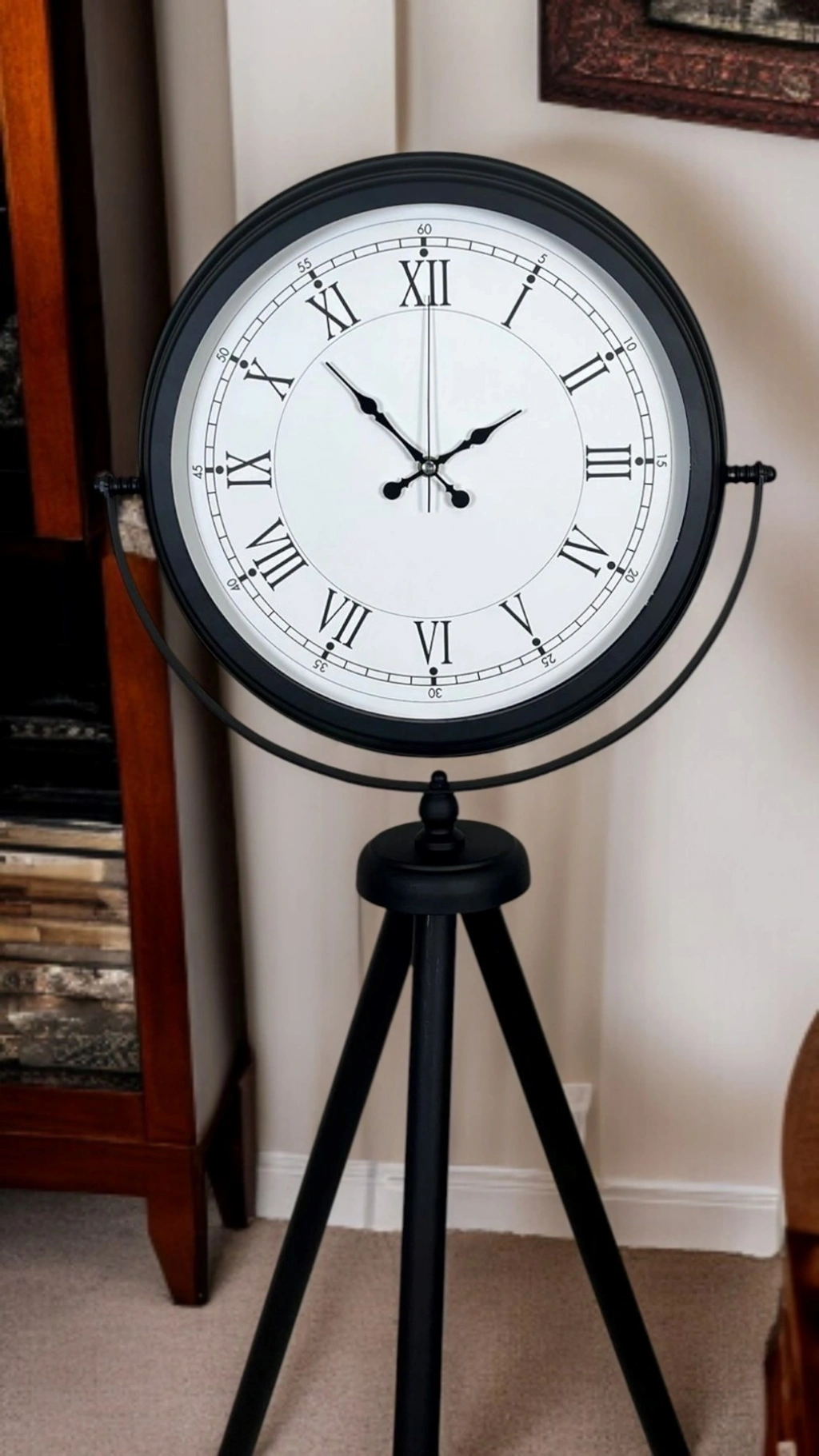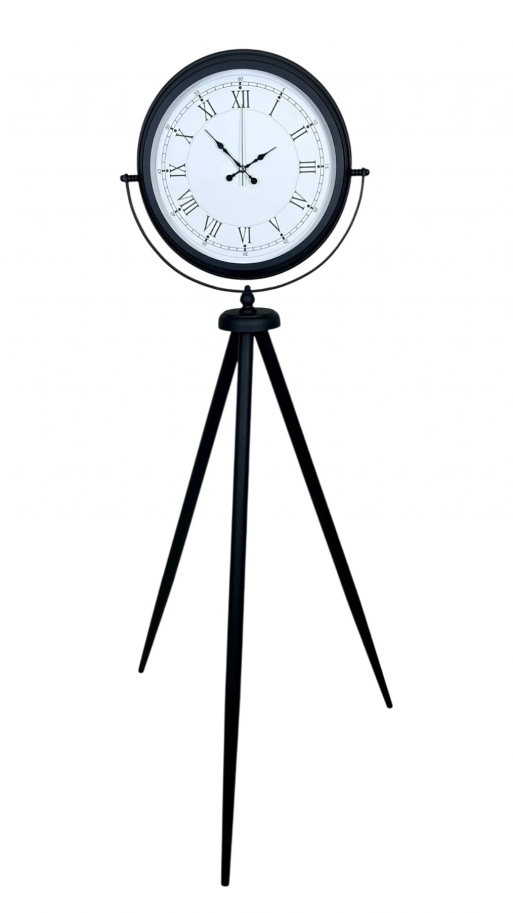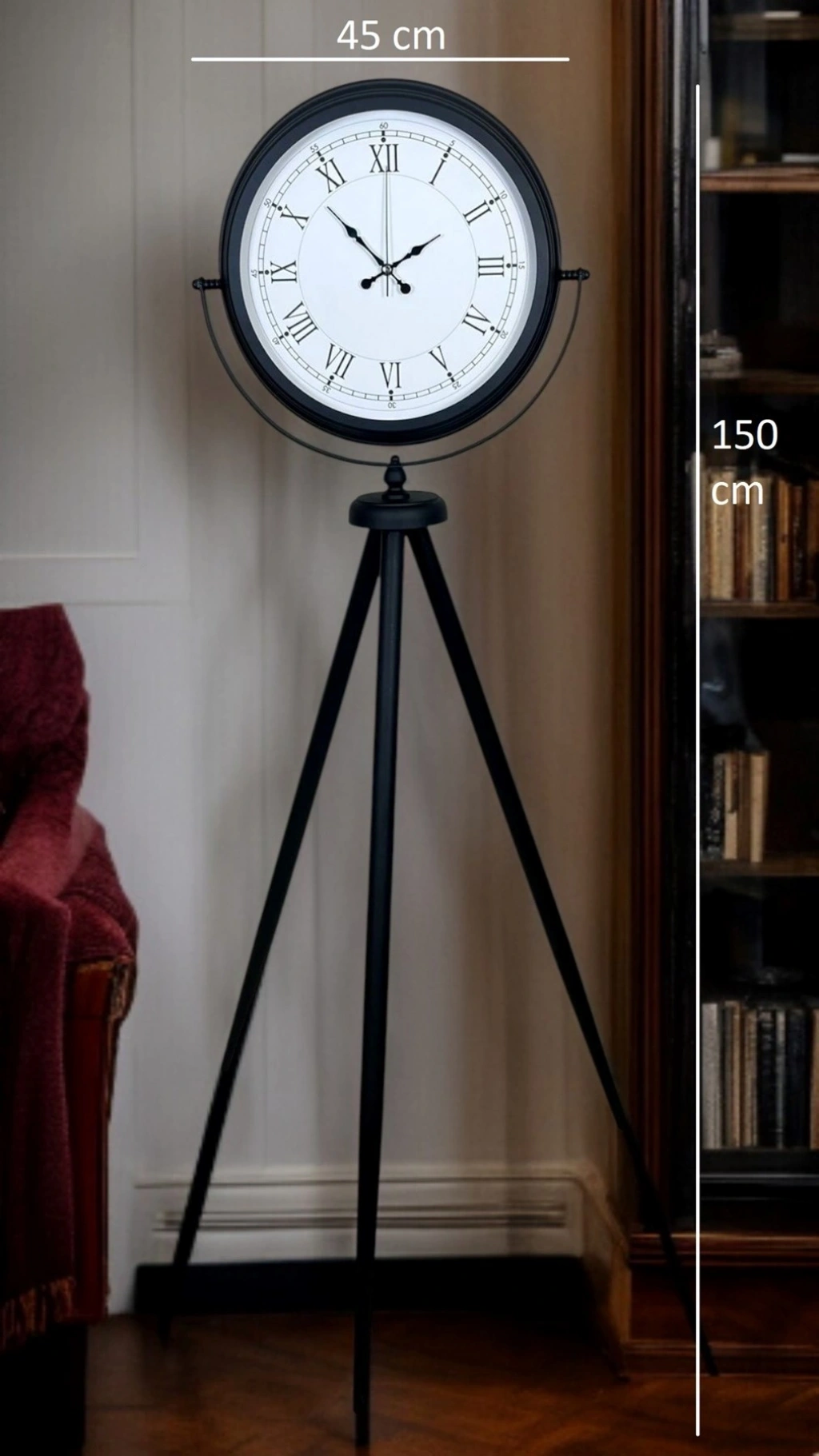 Klasik Roma rakamlarının zarafetini modern tripod tasarımla buluşturan Siyah Tripod Ayaklı Dekoratif Salon Saati, 150 x 45 cm ölçüsüyle bulunduğu ortamda güçlü ve şık bir duruş sergiler. Siyah metal tripod ayak yapısı; salon köşeleri, antre girişleri, ofis resepsiyon alanları ve mağaza vitrinleri için “vitrinlik” bir dekor etkisi oluşturur. Beyaz kadran üzerindeki Roma rakamları, saate zamansız bir karakter kazandırırken; sade ve net tasarımı sayesinde farklı dekorasyon stilleriyle kolayca uyum sağlar.