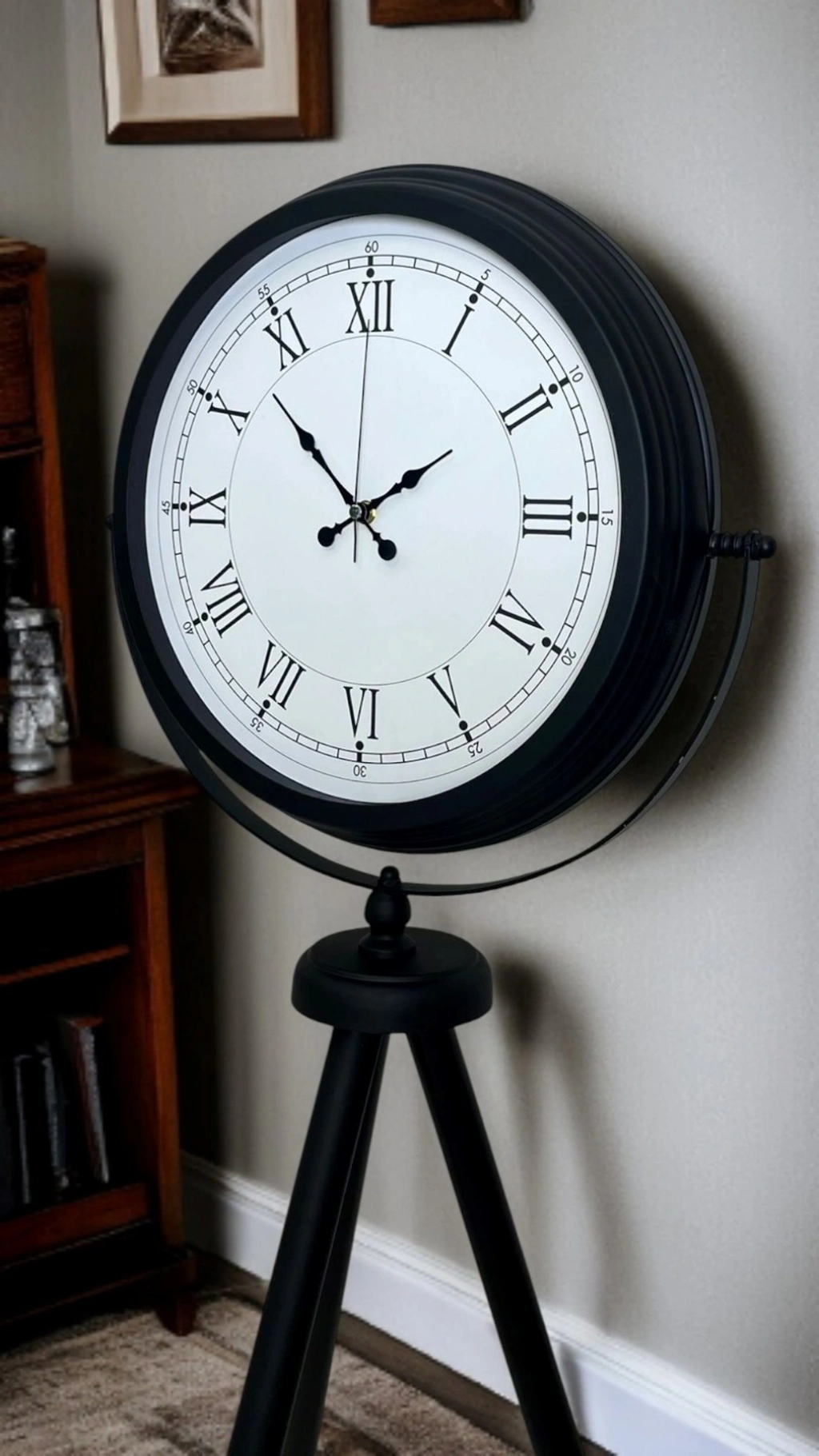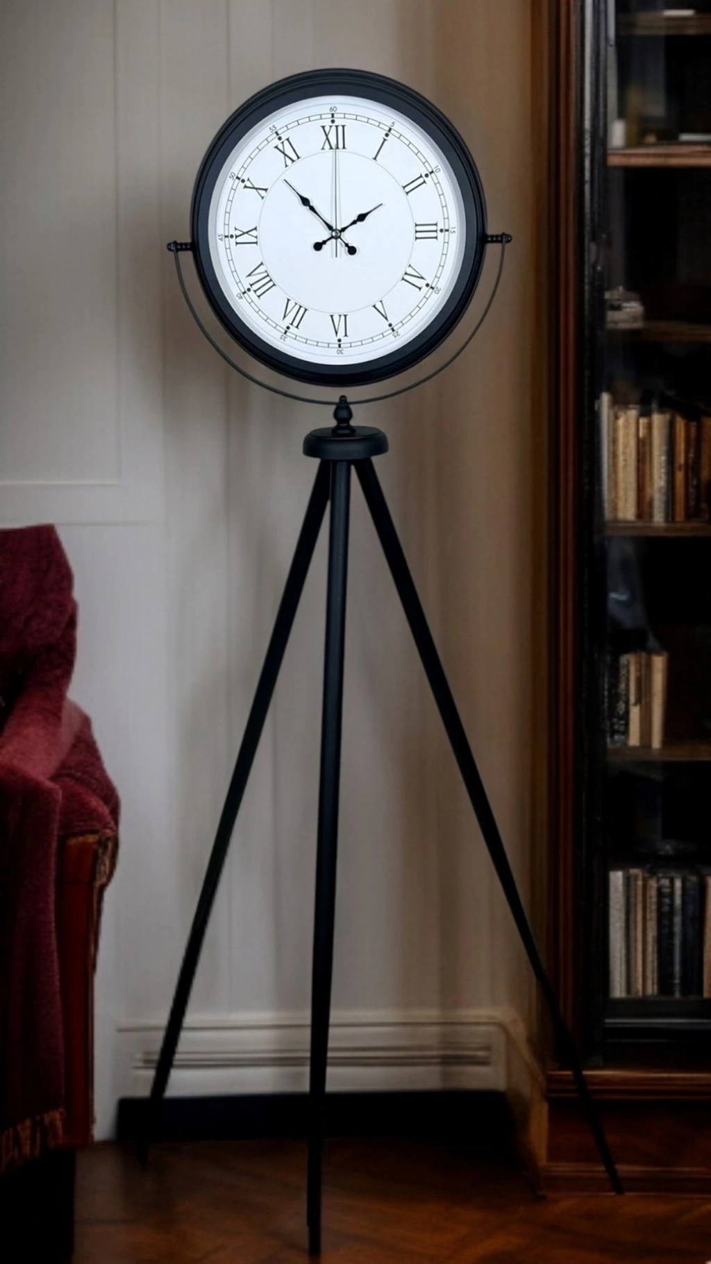 Tripod ayak formu sayesinde zeminde dengeli durur; mekâna modern bir çizgi ve şık bir atmosfer kazandırır. Klasik kadran sevenler için zarif, modern tasarım sevenler için güçlü bir dekor parçasıdır.