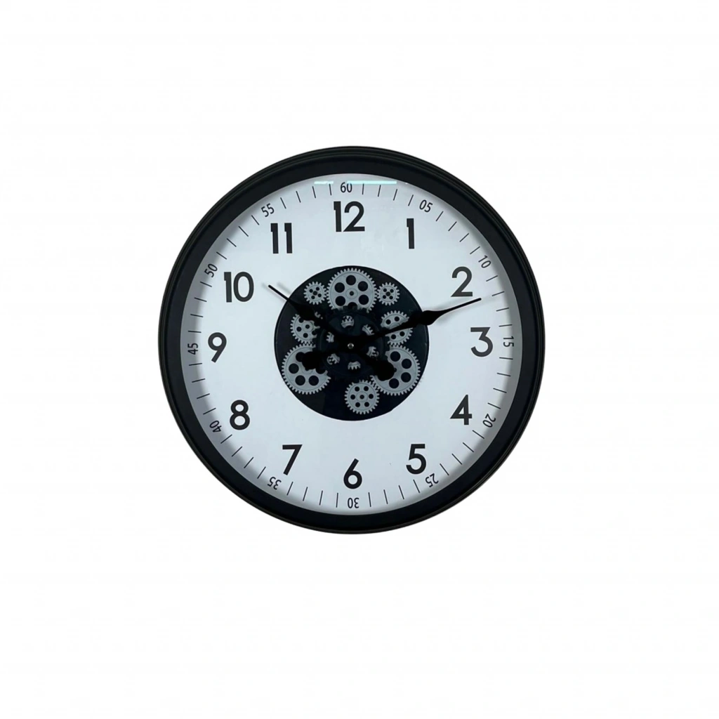 Orta bölümde yer alan hareketli çark mekanizması saate dinamik ve dikkat çekici bir görünüm kazandırır. Minimal tasarım ile mekanik detayların birleşimi, ürünü hem modern hem de dekoratif bir odak noktası haline getirir.