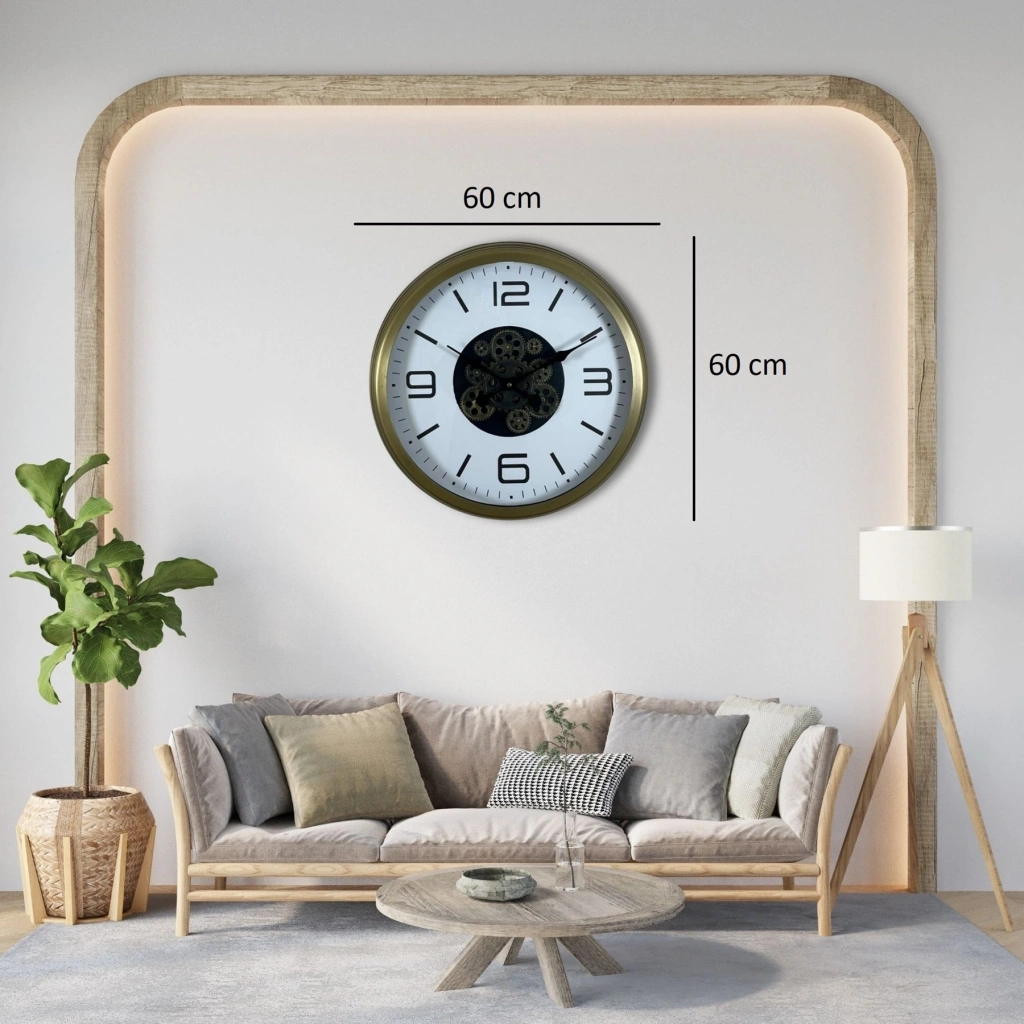 60 cm geniş çapı ve eskitme gold çerçevesi ile duvar dekorasyonunda dikkat çekici bir odak noktası oluşturur. Minimal sayı tasarımı ve sade kadranı sayesinde modern dekorasyonlara mükemmel uyum sağlar.