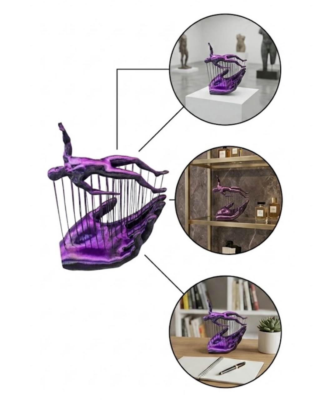 Dekorasyonuna farklılık katmak isteyenler için özel olarak tasarlanan bu 3D insan figürü, sanatsal görünümü ve modern çizgileri ile dikkat çeker. Mor renk tonlarının estetik kullanımı sayesinde bulunduğu ortamda şık bir ambiyans oluşturur.Ürünün üç boyutlu tasarımı, ona dinamik ve etkileyici bir görünüm kazandırır. İnsan figürü formu, sanatsal bir ifade sunarken aynı zamanda modern dekorasyon anlayışına uyum sağlar.Kompakt yapısı sayesinde dar alanlarda bile rahatlıkla kullanılabilir. Masa üstü dekorasyonu, raf düzenlemeleri veya duvar süsü olarak tercih edilebilir.Dayanıklı ve hafif yapısı sayesinde kullanım kolaylığı sağlar. Uzun süreli kullanım için uygundur ve estetik görünümünü korur.Hem kendiniz hem de sevdikleriniz için şık ve farklı bir dekoratif ürün arıyorsanız, bu ürün ideal bir seçim olacaktır. Modern ve sanatsal tarzı bir araya getiren tasarımı ile bulunduğu ortama değer katar.