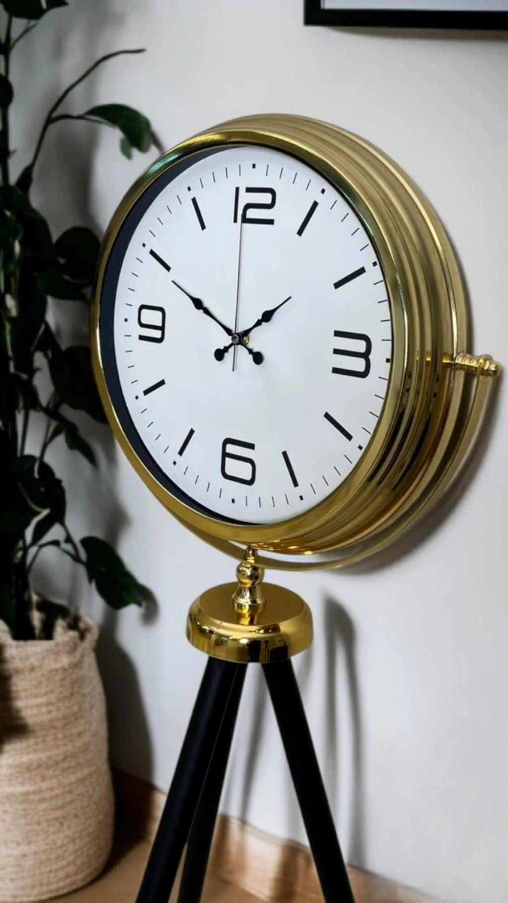 Modern tasarımı klasik detaylarla buluşturan Gold Tripod Ayaklı Dekoratif Saat, yaşam alanlarına güçlü bir karakter ve zamansız bir şıklık kazandırmak için tasarlandı. Geniş kadranı, zarif gold çerçevesi ve dengeli tripod ayak yapısıyla sadece zamanı gösteren bir obje değil, aynı zamanda bulunduğu mekânın odak noktası olan özel bir dekor parçasıdır.