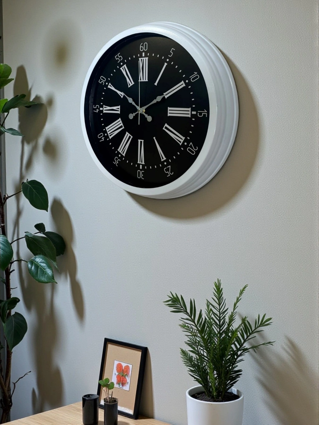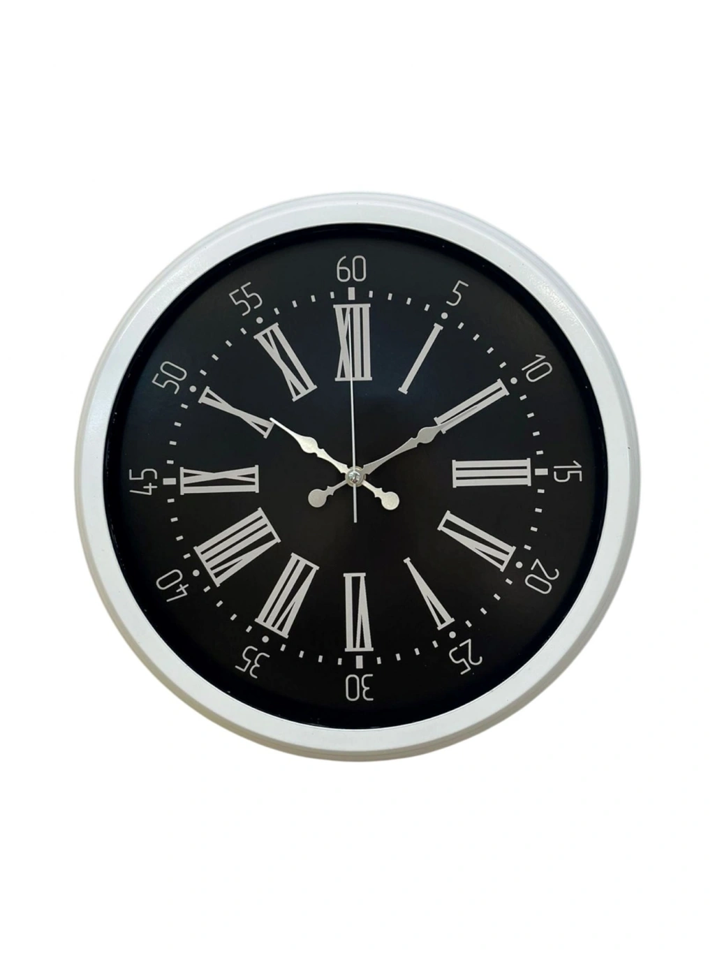 Klasik Roma rakamlarının asaleti ile modern siyah kadranın güçlü duruşunu bir araya getiren bu duvar saati, bulunduğu ortama hem şıklık hem de karakter kazandırır. Beyaz metal kasası sayesinde duvarda ferah bir görünüm sunarken, siyah zemin üzerindeki Roma rakamları ile dikkat çekici ve prestijli bir tasarım oluşturur.
