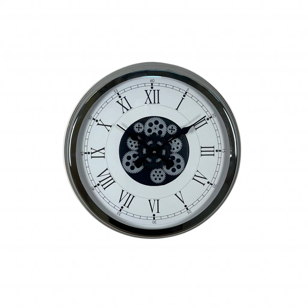 Parlak krom kasa, mekâna modern bir dokunuş sağlarken; Roma rakamlı beyaz kadran zamansız bir estetik sunar. İç kısımda yer alan dekoratif hareketli çark sistemi, saate mekanik ve dikkat çekici bir karakter kazandırır.