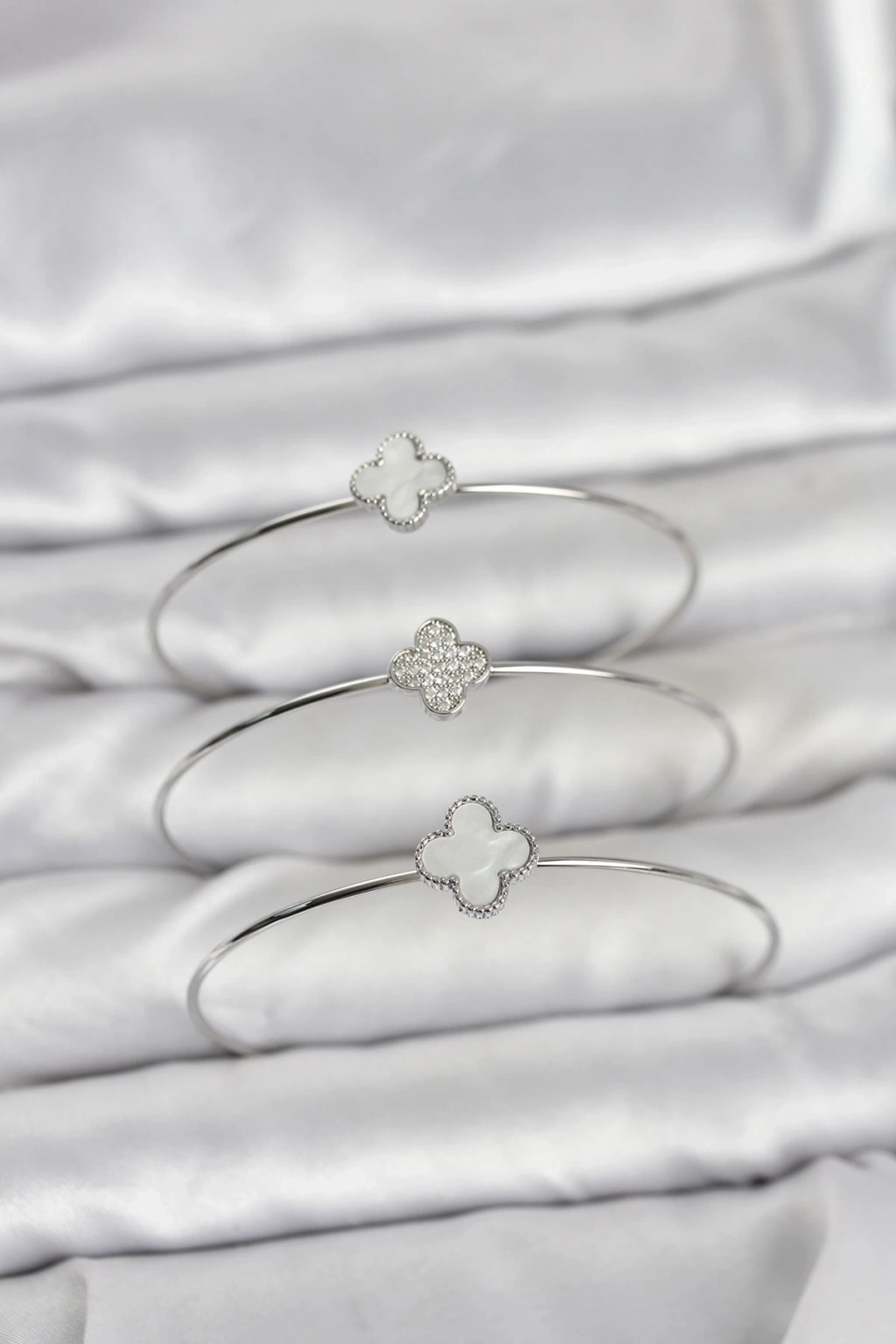 Mey İthalat® Gümüş Renk Yonca Model Zirkon Taşlı 3'lü Kadın Bileklik Kombini