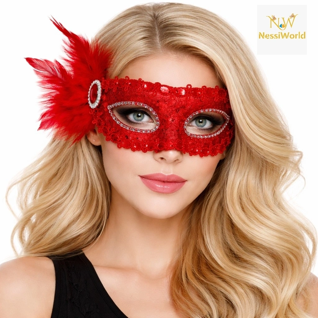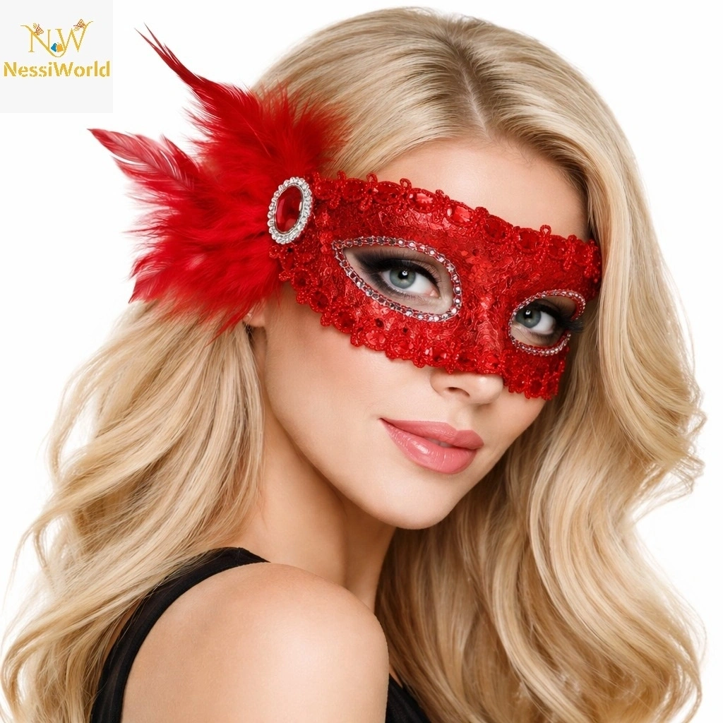 Mey İthalat® Kırmızı Taşlı Venedik Parti Maskesi – Tüylü Payetli