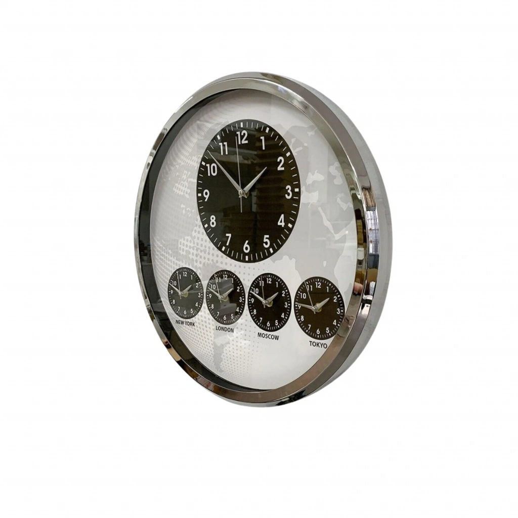 Şık krom metal çerçevesi ve dünya haritası desenli tasarımı ile bu 52 cm duvar saati; modern ofisler, yönetim odaları ve prestijli yaşam alanları için güçlü bir dekoratif tamamlayıcıdır.
