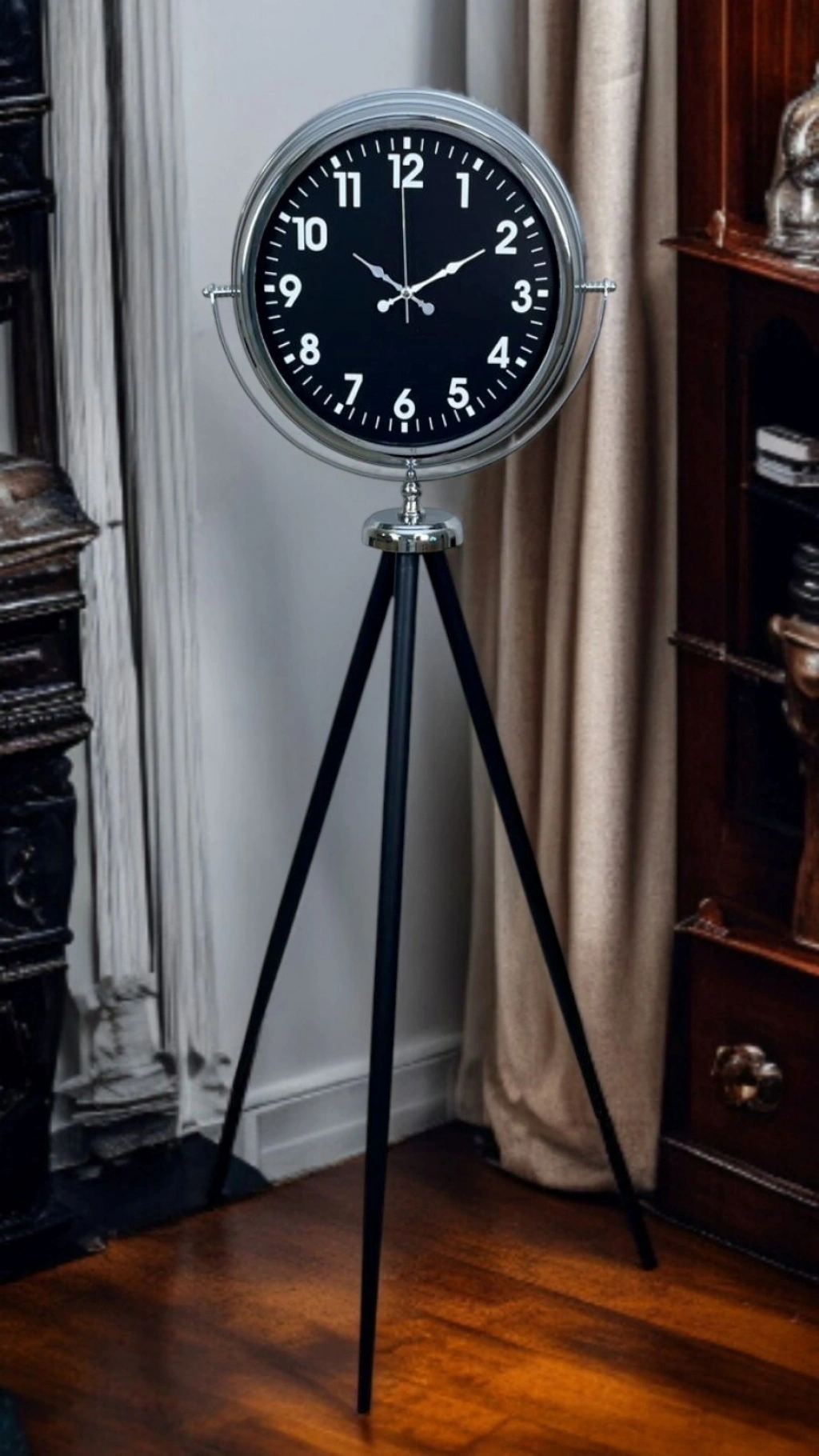 Modern çizgileri, güçlü duruşu ve zamansız tasarımıyla öne çıkan bu krom tripod ayaklı saat, sıradan saat modellerinden tamamen ayrılan özel bir dekoratif üründür. 150 cm yüksekliği ve 45 cm genişliği sayesinde bulunduğu ortamda yalnızca zamanı gösteren bir aksesuar değil, mekânın karakterini belirleyen şık ve iddialı bir tasarım objesi haline gelir.