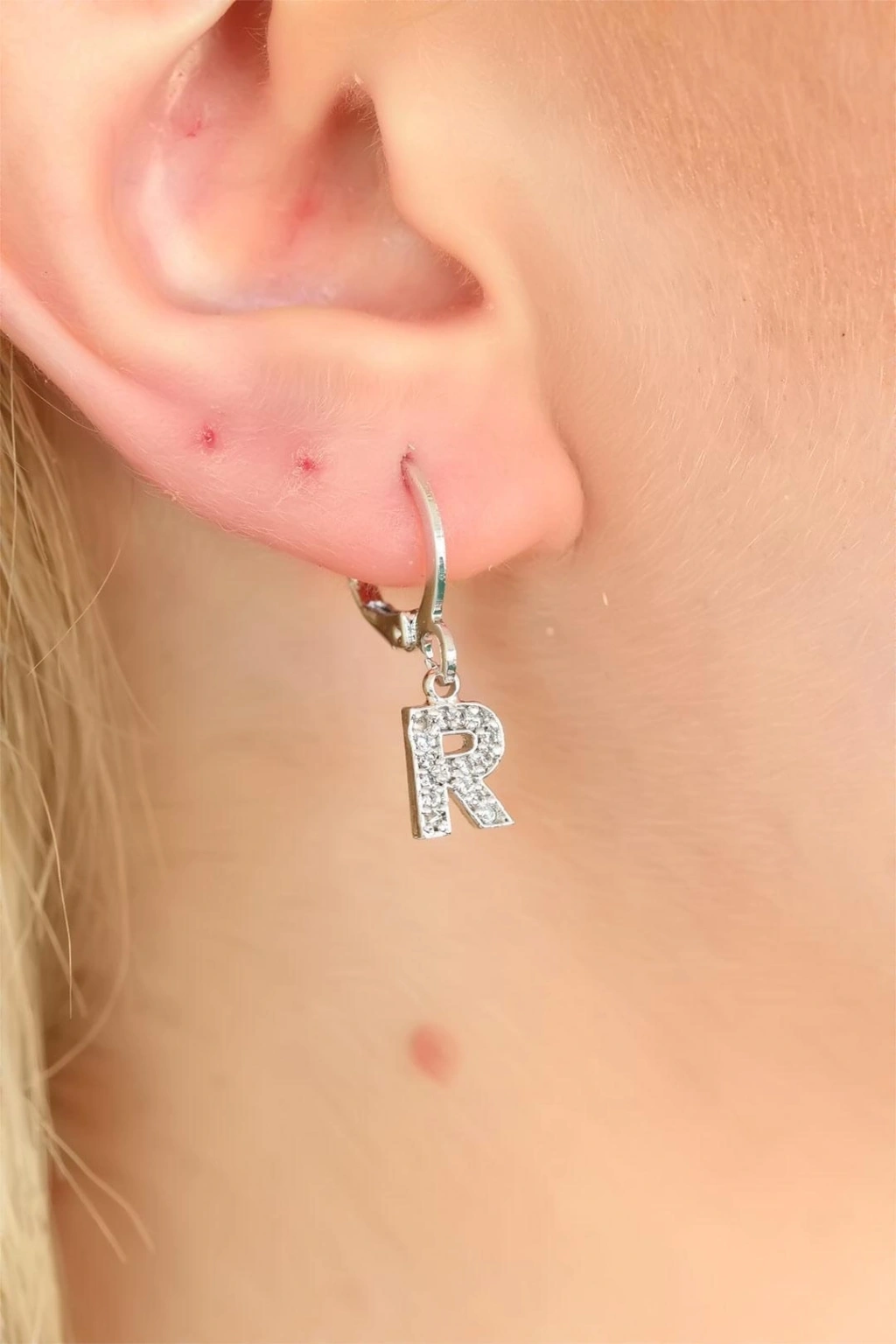 Silver Renk Zirkon Taşlı R Harf Bayan Küpe