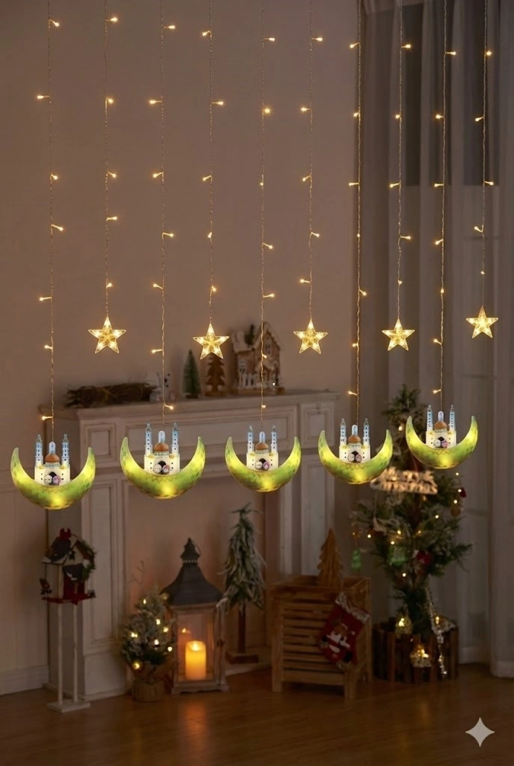Ev ve yaşam alanlarınıza şık ve anlamlı bir atmosfer katmak için tasarlanan perde LED ışık, Ramazan ve özel gün dekorasyonları için ideal bir tercihtir. Yıldız ve ay–cami figürlerinin zarif uyumu sayesinde hem klasik hem de modern dekorasyonlarla mükemmel uyum sağlar.