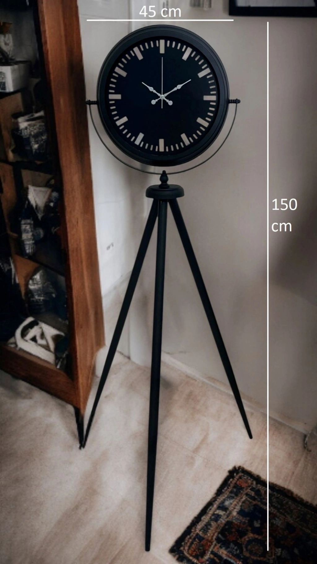 Modern ve minimal dekorasyonu sevenler için tasarlanan Siyah Tripod Ayaklı Dekoratif Salon Saati, 150 x 45 cm ölçüsüyle bulunduğu alanda güçlü bir “tasarım objesi” etkisi oluşturur. Siyah metal tripod ayak formu, ürüne hem şık hem de dengeli bir duruş kazandırırken; siyah kadran üzerindeki modern indeks (çubuk) göstergeler sade ve premium bir görünüm sunar. Rakam karmaşasından uzak, net ve modern kadran yapısı sayesinde bu model; loft, endüstriyel ve çağdaş dekorasyon stillerine mükemmel uyum sağlar.