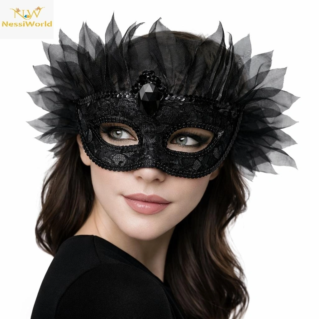 Mey İthalat® Siyah Taşlı Venedik Maskesi Lüks Tüllü Parti Maskesi