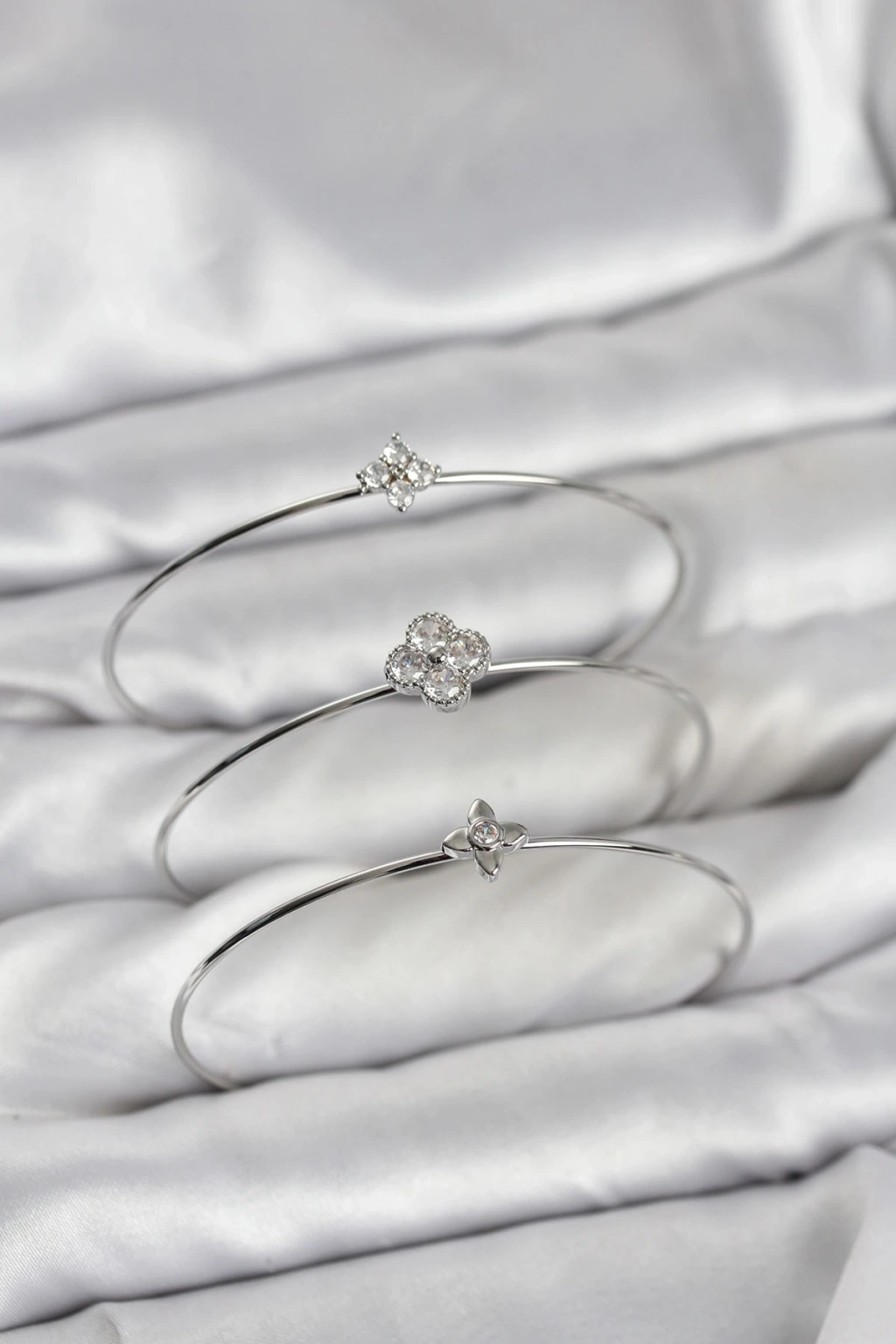 Mey İthalat® Zirkon Taşlı Gümüş Renk Yonca Tasarım 3'lü Kadın Bileklik Kombini